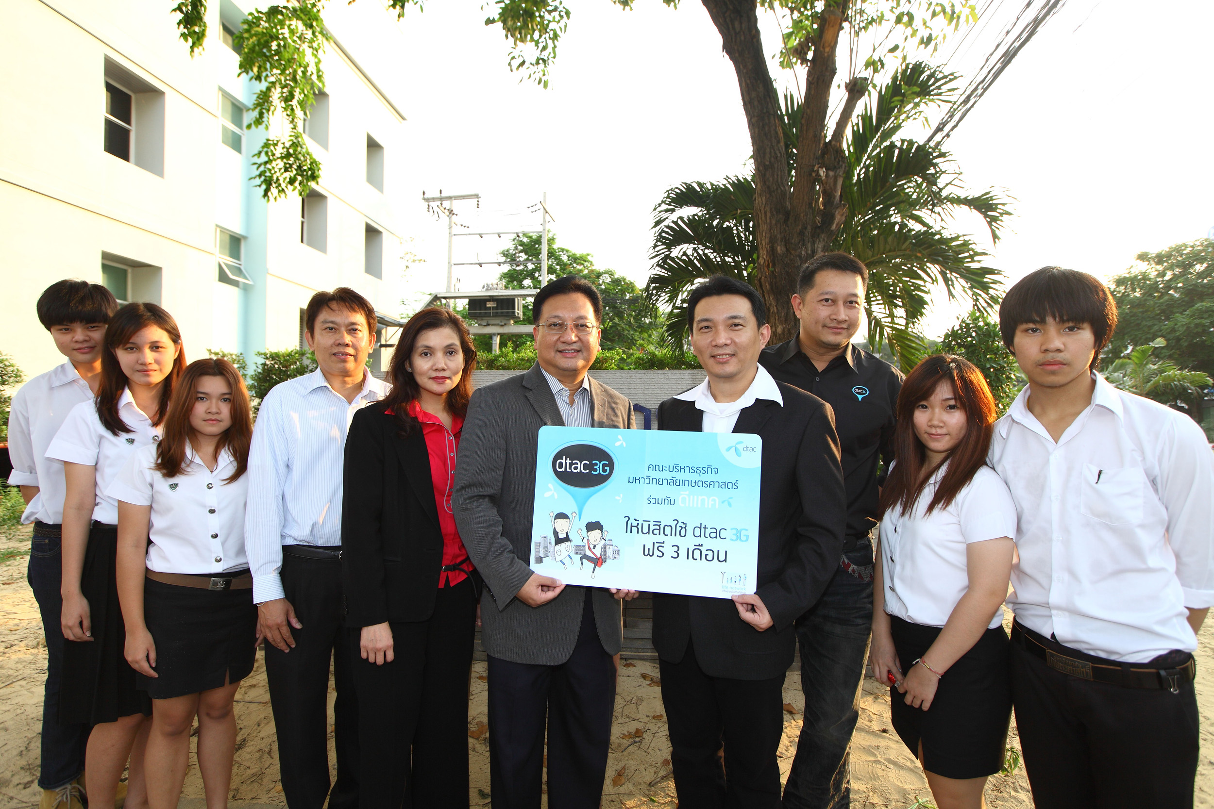 28 มีนาคม 2555 – นายชัยยศ จิรบวรกุล รองประธานเจ้าหน้าที่บริหาร กลุ่มลูกค้า บมจ.โทเทิ่ล แอ็คเซ็ส คอมมูนิเคชั่น (ดีแทค) มอบสิทธิพิเศษในการทดลองใช้แพ็กเกจ 3G ให้นิสิต และบุคลากรของคณะบริหารธุรกิจ มหาวิทยาลัยเกษตรศาสตร์ได้ใช้ฟรี เป็นระยะเวลา 90 วัน โดยสามารถใช้ได้ทั้งระบบเติมเงิน และระบบรายเดือน เพื่อเป็นการแนะนำให้กลุ่มลูกค้าได้ทราบถึงประสิทธิภาพของเครือข่าย 3G ของดีแทค ซึ่งบริษัทมีนโยบายที่จะให้ลูกค้าได้ทดลองใช้บริการ โดยสถาบันการศึกษาในระดับอุดมศึกษาเป็นหนึ่งในกลุ่มที่ดีแทคเห็นความสำคัญในการนำประโยชน์จากเทคโนโลยีไปใช้เพื่อขยายขอบเขตของการเรียนการศึกษาได้