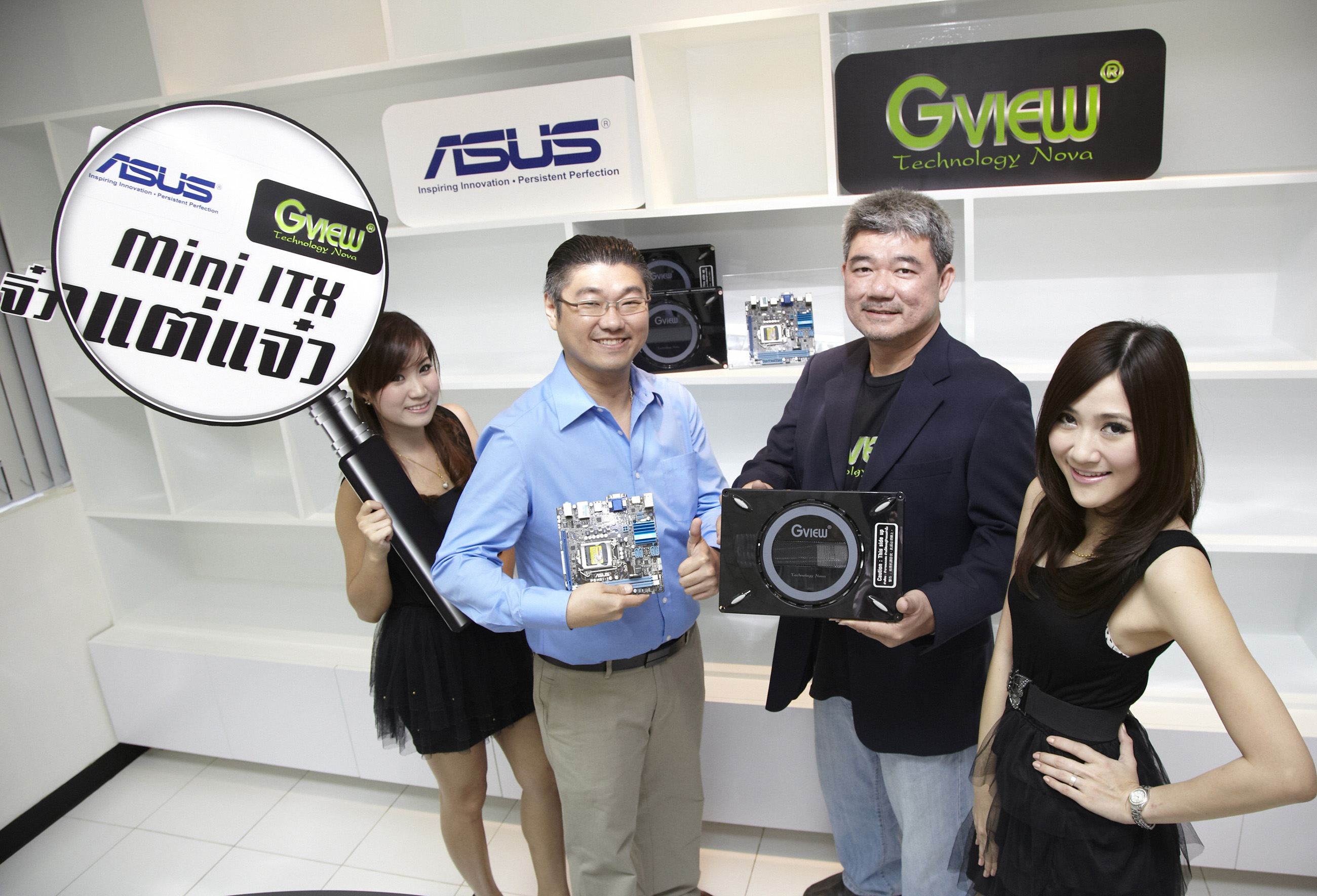 นายกฤตพล บุญยกิดา (ที่ 3 จากซ้าย) ผู้อำนวยการฝ่ายขายและการตลาด บริษัท หัวเหลียน คอมพิวเตอร์ จำกัด พร้อมด้วย นายมนต์ธีร์ วุฒิรงค์ (ที่ 2 จากซ้าย) ผู้จัดการพัฒนาธุรกิจกลุ่มผลิตภัณฑ์โอเพ่นแพลทฟอร์ม บริษัท อ้สซุสเทค คอมพิวเตอร์ (ประเทศไทย) จำกัด ผนึกกำลังเปิดตัวผลิตภัณฑ์ใหม่ Gview & Asus Mini ITX “ Body จิ๋ว…ราคา แจ๋ว” เซ็ตผลิตภัณฑ์คู่ GVIEW MINI ITX Case และ ASUS MainboardMini ล้ำด้วยดีไซน์โดดเด่น เล็กกะทัดรัดพกพาสะดวก ง่ายต่อการใช้งาน ประสิทธิภาพสูง สมรรถนะเทียบเท่าคอมพิวเตอร์ขนาดปกติ สามารถใช้สอยบนขนาดพื้นที่จำกัด พร้อมจัดโปรโมชั่นพิเศษราคาสุดคุ้มครั้งแรก ในงาน “Pantip Hot Sale 2012” ระหว่างวันที่ 30 มี.ค. – 8 เม.ย. 2555