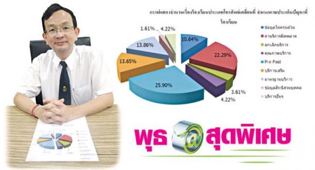 ทั้งนี้ หากแยกบริการด้านโทรคมนาคมเฉพาะประเภทโทรศัพท์เคลื่อนที่ พบว่า 1 ม.ค.-15 พ.ค.55 มีเรื่องร้องเรียนเข้ามา 498 เรื่อง ปัญหาร้องเรียนมากสุด คือ บัตรเติมเงิน ค่าบริการผิดพลาด และมาตรฐานบริการ ตามลำดับ ซึ่งน้อยกว่าจำนวนเลขหมายโทรศัพท์เคลื่อนที่ปัจจุบันที่ใช้งานอยู่ 70 ล้านเลขหมายเป็นอย่างมาก