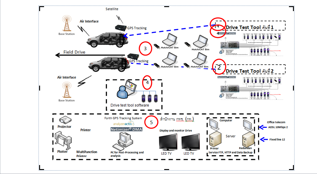 1), 2) และ 3) เครื่องมือ Drive Test เป็นแบบ Hardware based แต่ละชุดจะติดตั้งในรถทั้ง 2 คัน โดยจะสามารถต่อโทรศัพท์ได้ทั้งหมด 16 port และทำงานพร้อมกันได้แบบ Benchmarking ซึ่งจะทำให้สามารถทดสอบคุณภาพโครงข่ายของผู้ให้บริการโทรศัพท์เคลื่อนที่ได้ 4 เจ้าพร้อมกัน โดยจะสั่งงานในโปรแกรมที่ติดตั้งในคอมพิวเตอร์ ชื่อว่าโปรแกรม MDM2 ซึ่งเป็นโปรแกรมที่เอาไว้ใช้ควบคุมการเปิด ปิดโทรเข้า โทรออก การตั้งค่าต่างๆของโทรศัพท์ที่ต่อกับ port และสามารถเก็บค่าคุณภาพโครงข่ายโทรศัพท์เคลื่อนที่ได้ เช่น ค่าอัตราโทรสำเร็จ ค่า Fail, Drop ,ความแรงของสัญญาณโทรศัพท์ เป็นต้น โดย Hardware 1 ชุด จะเปรียบเสมือนเราสั่งงาน Software based ได้ 4 ชุดพร้อมกัน