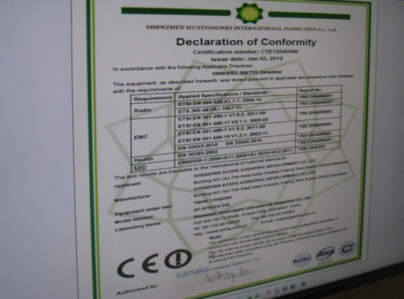น.อ.สุรพล กล่าวว่า การตรวจรับแท็บเล็ตป.1 ของกระทรวงไอซีที พบว่า สโคปใช้มาตรฐานรับรองการแผ่กระจายคลื่นแม่เหล็กไฟฟ้าสากลตามมาตรฐานของ CE หรือ Conformite Europeene ซึ่งเป็นมาตรฐานที่เทียบเท่ากับ FCC จึงถือว่าเป็นไปตามทีโออาร์