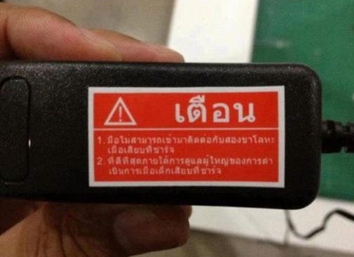 ภาพที่เห็นเป็นปลั๊กแท็บเล็ตป.1 ล๊อต 2,000 เครื่องที่มีคำเตือน! ซึ่งเป็นภาษาไทยแบบงงๆ ว่า “มือไม่สามารถเข้ามาติดต่อกับสองขาโลหะเมื่อเสียบที่ชาร์จ” และ “ที่ดีที่สุดภายใต้การดูแลผู้ใหญ่ของการดำเนินการเมื่อเด็กเสียบที่ชาร์จ”