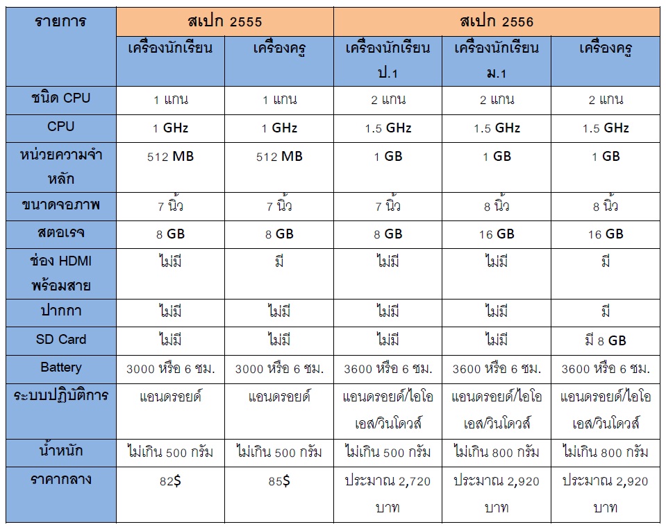 หากเทียบสเปกแท็บเล็ตในปีที่แล้วกับสเปกแท็บเล็ตล๊อตใหม่ที่จะออกมาให้ได้ใช้ในเทอมนี้ จะเห็นว่ามีประสิทธิภาพเพิ่มขึ้น อาทิ แรมจากเดิม 512 เมกะไบต์ แต่ในปีนี้จะเพิ่มเป็น 1 กิกะไบต์ และเครื่องทั้งหมดใช้หน่วยประมวลผลดูอัลคอร์ 1.5 กิกะเฮิร์ตซ ขนาดจอแท็บเล็ต ป.1 กว้าง 7 นิ้ว ฮาร์ดดิสก์ 8 กิกะไบต์ ในขณะที่แท็บเล็ต ม.1 และแท็บเล็ตของครู หน้าจอขนาด 8 นิ้ว ฮาร์ดดิสก์ 16 กิกะไบต์ ระบบปฏิบัติการแอนดรอยด์ ต้องเวอร์ชั่น 4.0 ขึ้นไป โดยสเปกทั้งหมดนี้เป็นสเปกที่จะอยู่ในเงื่อนไขการประมูลจริง
