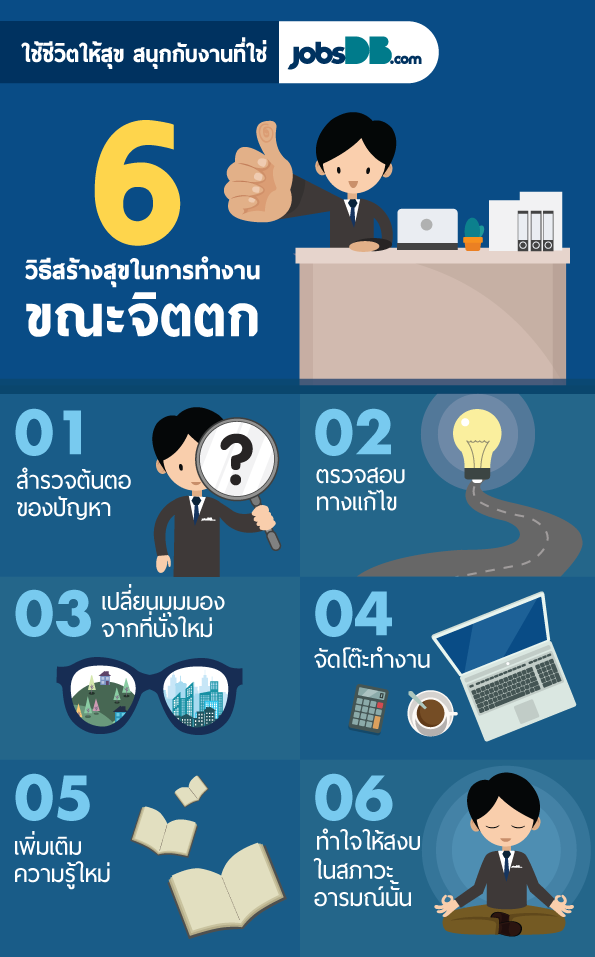 บริษัท จัดหางาน จ๊อบส์ ดีบี (ประเทศไทย) จำกัด เสนอวิธีการหลบเลี่ยงความเครียด และเอาชนะอุปสรรคในจิตใจง่ายๆ 6 วิธีดังนี้ เพื่อให้การทำงานราบรื่นขณะที่อยู่ในสภาวะจิตใจไม่ปกติ หรือเรียกว่าจิตตก