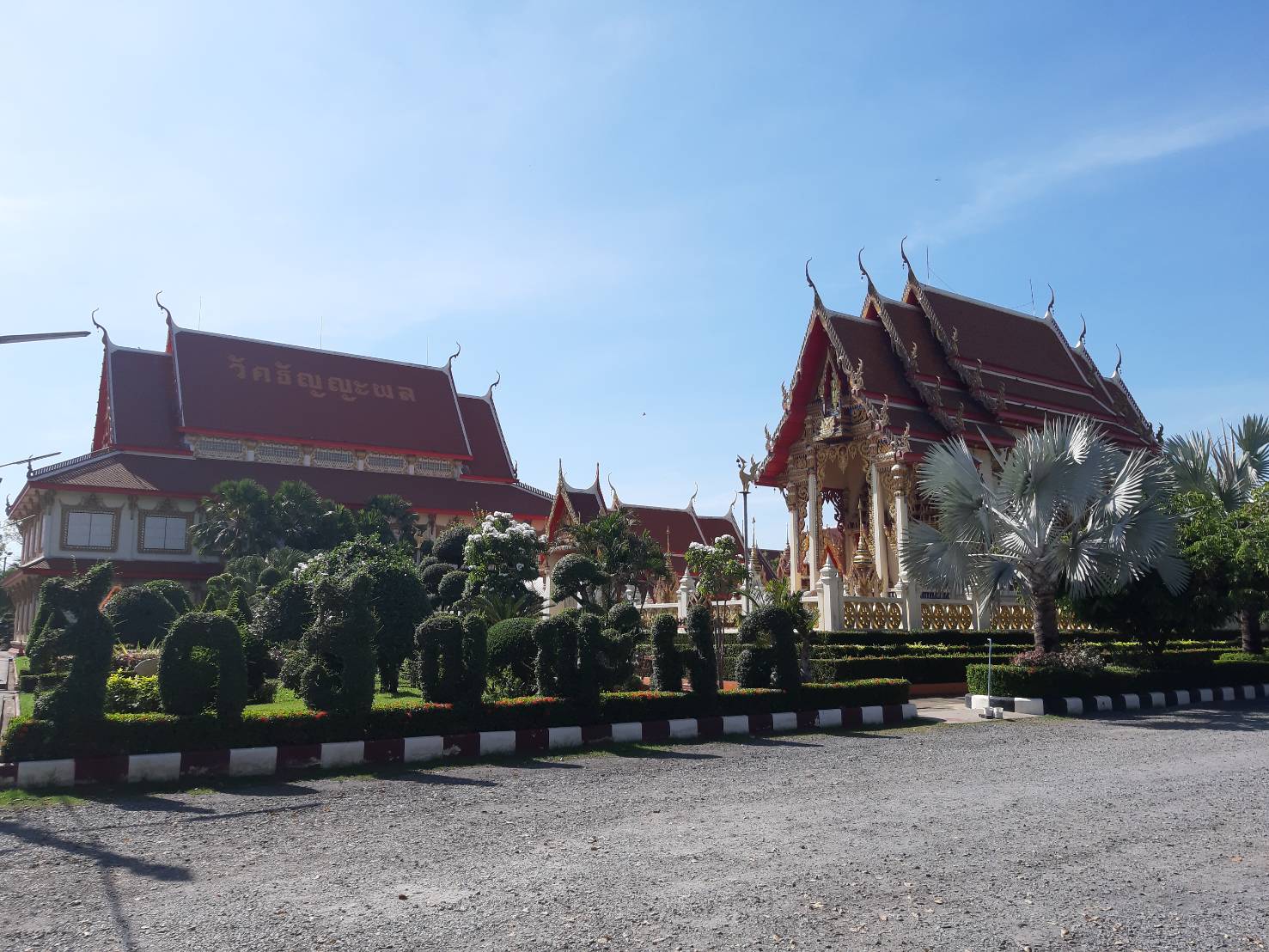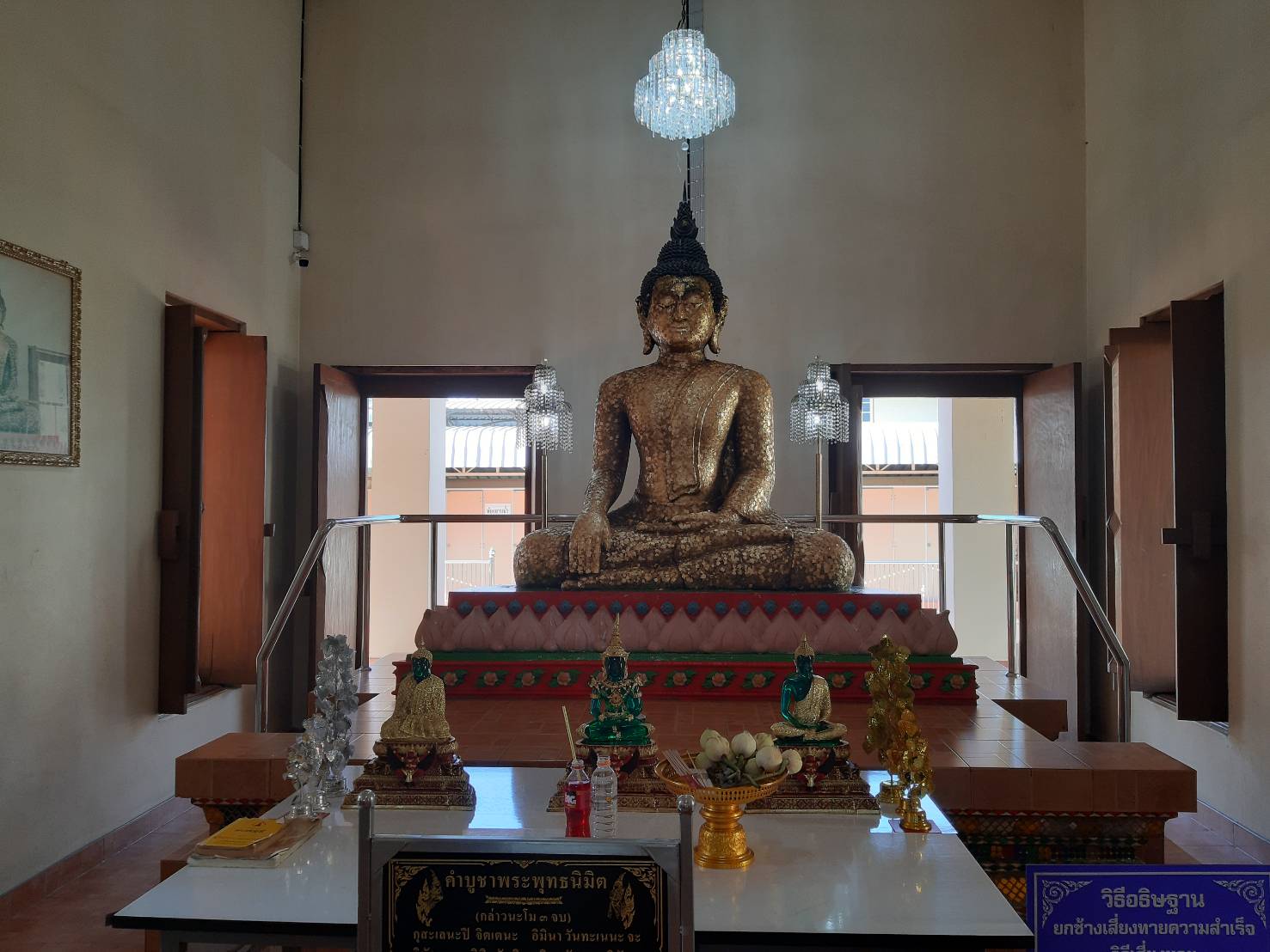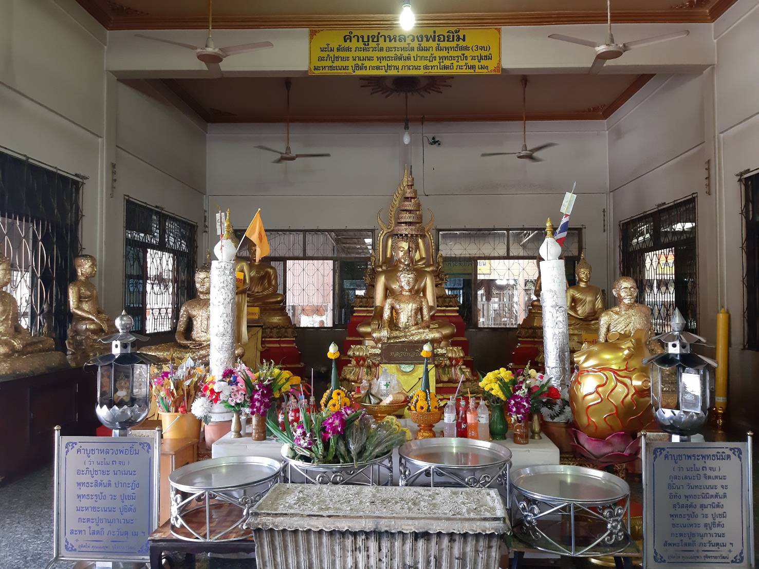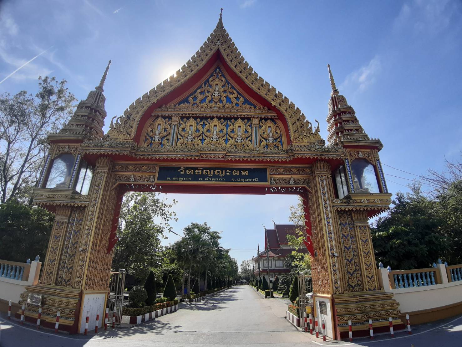 ตามประวัติเล่าว่า หลวงพ่อยิ้มแสดงปาฏิหาริย์ลอยน้ำมาโผล่ที่ปากคลองแปดระหว่างเขตวัดกับบ้านเถ้าแก่พูน ประมาณ ต้น พ.ศ. 2410 โผล่แต่เกศ ปู่โต๊ะเป็นคนอัญเชิญขึ้นมาประดิษฐานไว้หน้าโบสถ์หลังเก่า ต่อมานำไปไว้ที่ศาลาฤาษี จากนั้นได้อัญเชิญมาประดิษฐานที่หน้าวัด ปัจจุบันได้อัญเชิญมาประดิษฐานอยู่หน้าศาลาการเปรียญของวัดธัญญะผล นอกจากนี้ยังมีพระพุทธรูปศักดิ์สิทธิ์ที่มีอายุกว่า 105 ปี (หลวงพ่อโต) โดยภายในวัดมีคลองสามารถให้อาหารปลาได้ (วังมัจฉา)