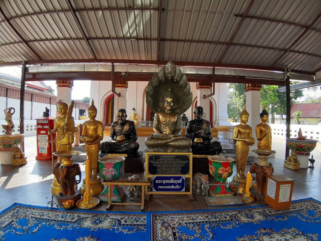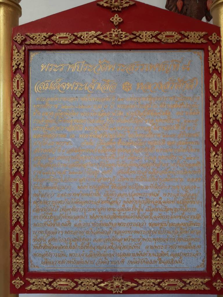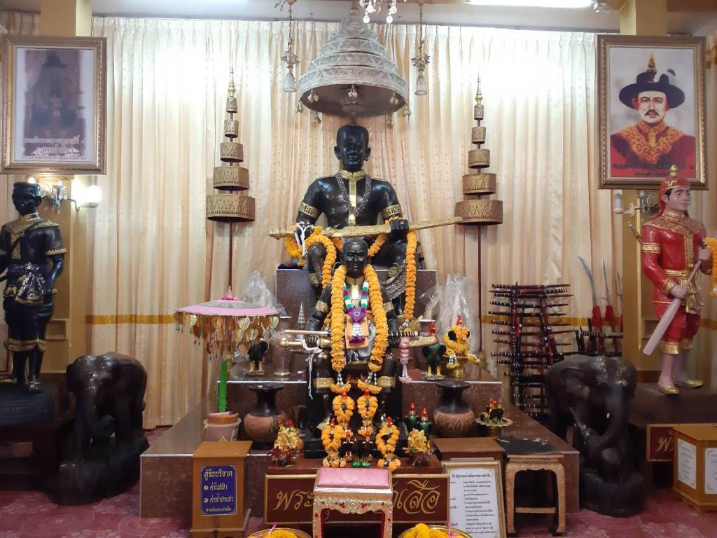 ครั้งเสด็จประพาสเมืองสาครบุรี ปัจจุบันคือ จ.สมุทรสาคร ด้วยเรือพระที่นั่ง เมื่อถึง ต.โคกขาม คลองที่นั่นคดเคี้ยวมาก พันท้ายนรสิงห์ ซึ่งถือท้ายเรือพระที่นั่งได้ทราบข่าวล่วงหน้ามาว่ามีผู้ดักลอบปลงพระชนม์พระเจ้าเสือ ด้วยความจงรักภักดี พันท้ายนรสิงห์จึงจงใจคัดท้ายเรือให้โขนเรือชนกิ่งไม้เพื่อยุติการประพาสทางทะเลในครั้งนั้น ทำให้โขนเรือพระที่นั่งกระทบกิ่งไม้ใหญ่หักตกลงน้ำ พันท้ายนรสิงห์จึงกราบบังคมทูลขอทรงพระกรุณาโปรดเกล้าให้ทำศาลขึ้นที่นี่และตัดเอาศีรษะของตนกับโขนเรือพระที่นั่งซึ่งหักตกลงน้ำขึ้นมาบวงสรวงไว้ด้วยกัน ต่อมาพระเจ้าเสือถวายตำหนักเดิมนาม “วัดตึก” ภายในวัดมีพระตำหนักพระเจ้าเสือ และพระพุทธรูปให้ได้สักการะ