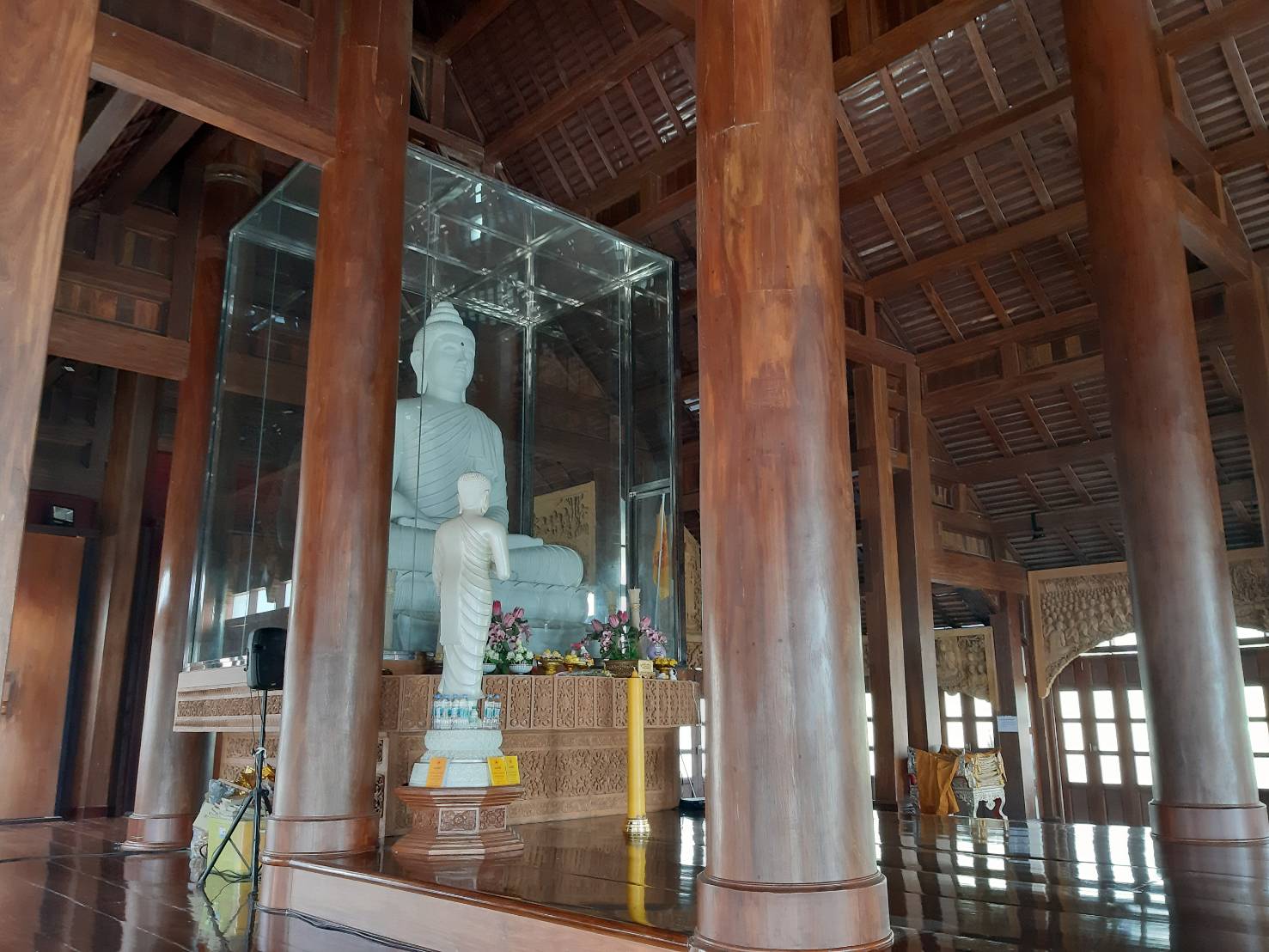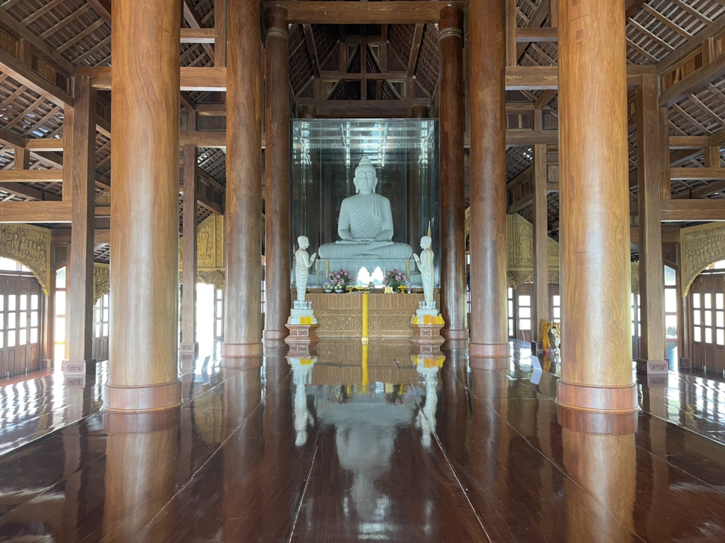 สำหรับหินหยกขาวที่ใช้แกะสลักนั้นได้ค้นหาจากพม่าในช่วงแรก จนสุดท้ายมาได้หินหยกขาวจากจีน และใช้ช่างฝีมือเยี่ยมของจีน มิสเตอร์ วู เต๊อเชียง (Wu Deqiang) เป็นผู้แกะสลัก ก่อนจะแกะองค์พระทุกครั้ง มิสเตอร์วู จะทำการรักษาศีล กินเจ ปฏิบัติธรรม สวดมนต์ไหว้พระล่วงหน้าก่อน 7-8 วัน แล้วค่อยไปทำการแกะพระด้วยมือของท่านเอง มิสเตอร์ วู ได้รับรางวัลที่ 1 ในระดับชาติ ที่ปักกิ่ง ในด้านการเป็นศิลปินแกะพระหิน เมื่อปี 2014 ท่านมีความสามารถในการแกะลูกนัยน์ตา ไม่ว่าเราจะยืนอยู่มุมไหน เมื่อมองไปที่องค์พระ จะมีความรู้สึกเหมือนกับว่า องค์พระท่านจ้องมองเรา ด้วยสายตาที่มีเมตตามาก