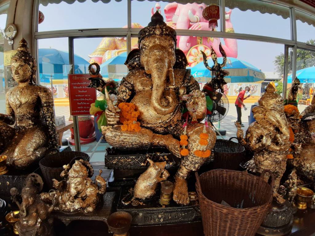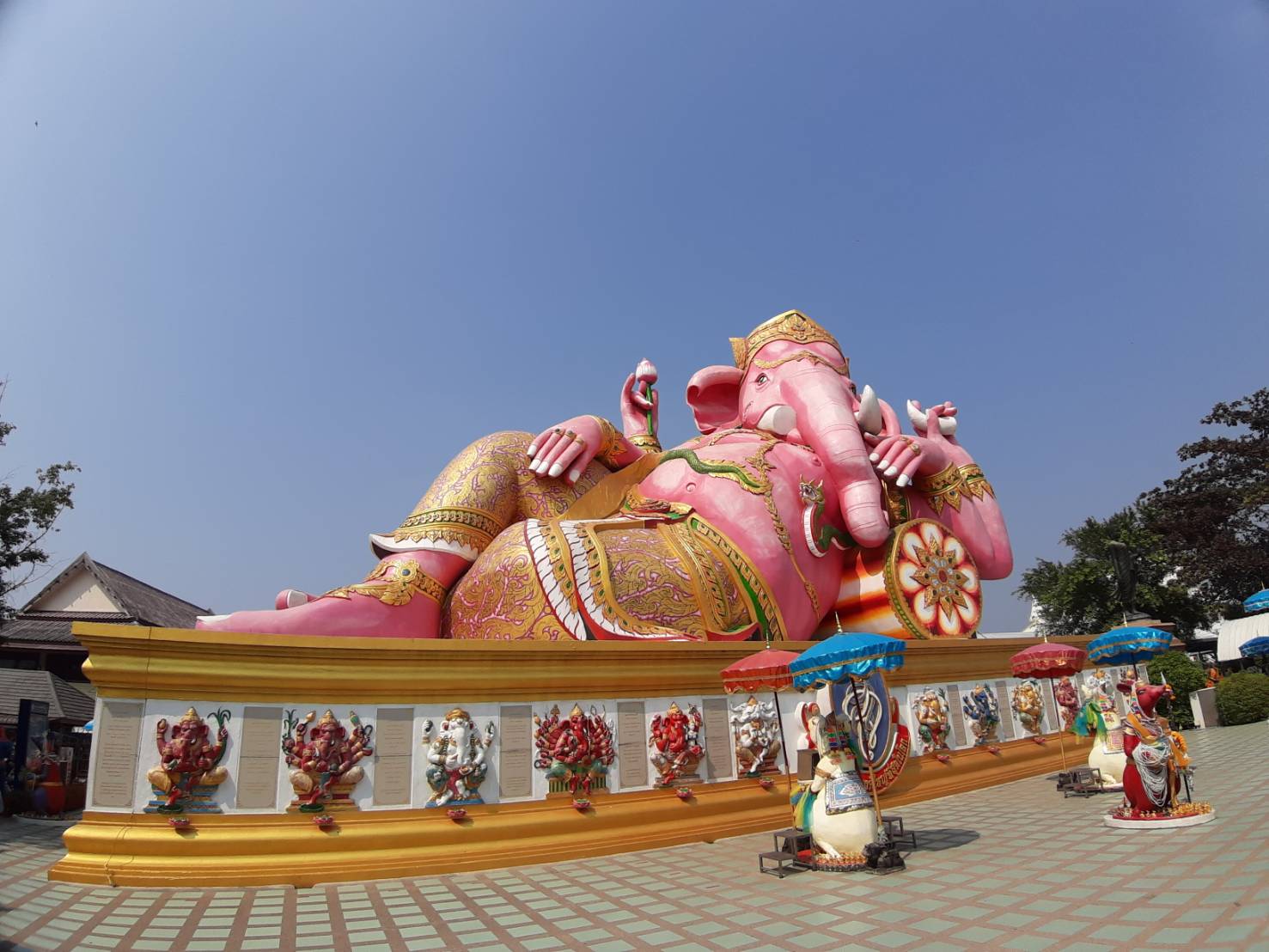 องค์พระพิฆเนศ มีความสูง 16 เมตร ยาว 24 เมตร มีสีชมพูสวยงาม ลักษณะกึ่งนั่ง กึ่งนอนตะแคง พระหัตถ์ขวาถือดอกบัว พระหัตถ์ซ้ายถืองาที่หัก หากใครได้เดินทางมากราบไหว้จะนำความสุขสบายมาสู่ชีวิต รอบฐานมีปางต่าง ๆ ถึง 32 ปางให้ชม ภายใต้ฐานพระพิฆเนศเป็นพิพิธภัณฑ์แสดงเกี่ยวกับพระพิฆเนศปางต่างๆ และประวัติวัด