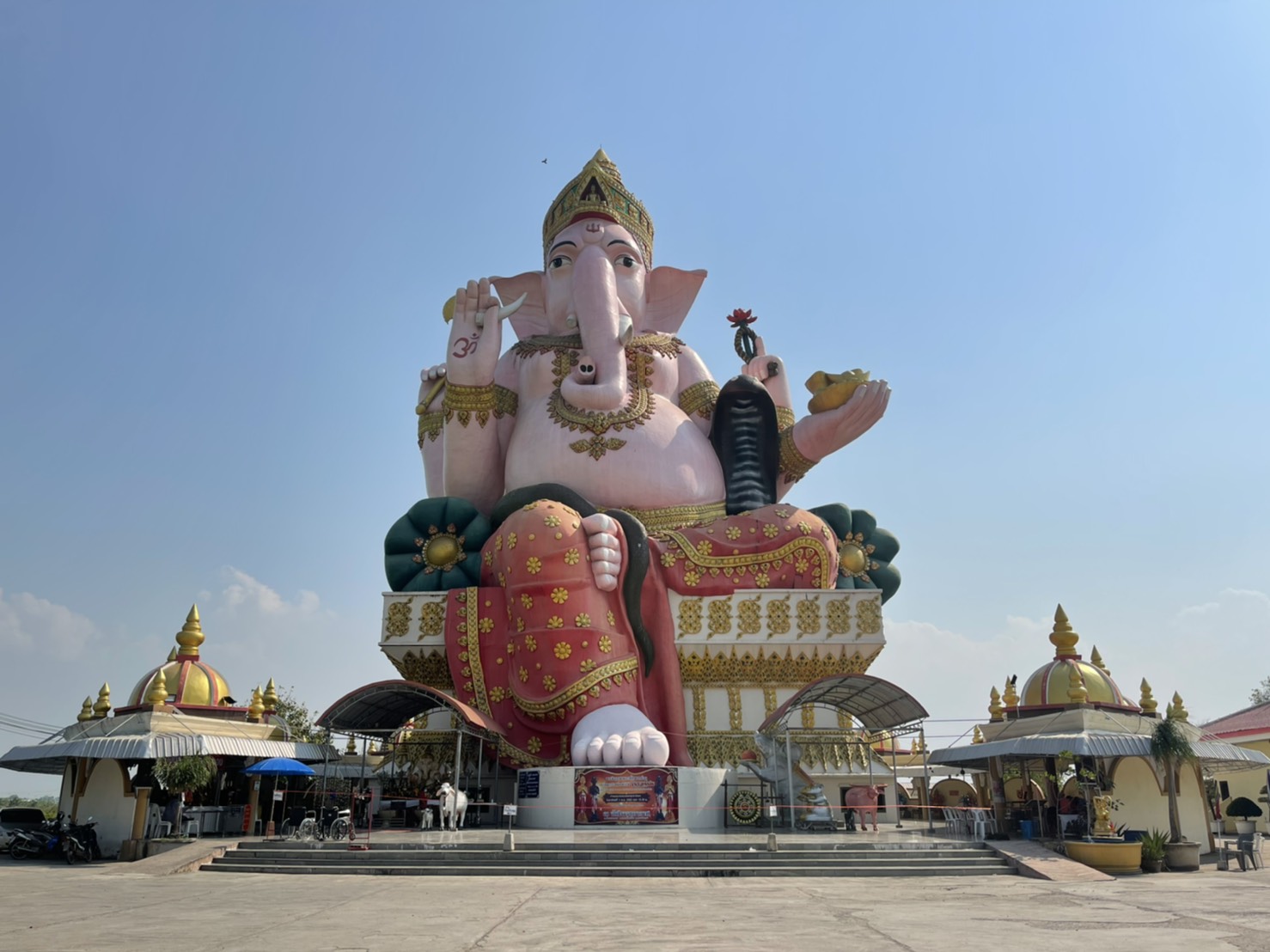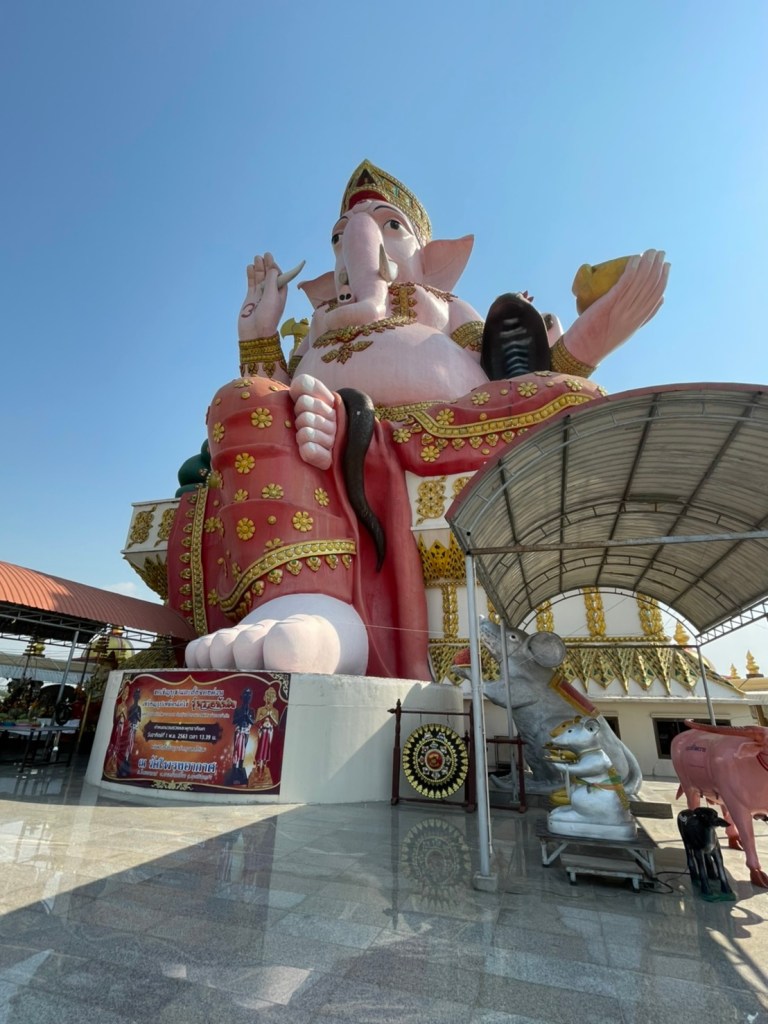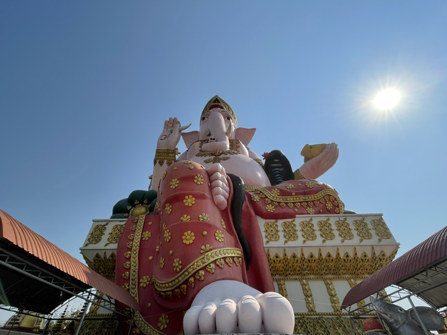 องค์พระพิฆเนศ ปางนั่งประธานพร นั่งอยู่บนตั่ง มีความสูง 49 เมตร ไม่รวมฐาน และกว้าง 19 เมตร ผิวเนื้อเป็นสีชมพู มีหัตถ์ทั้งหมด 4 กร มีงูใหญ่สีดำอยู่ข้างเอว บนศีรษะสวมพระมาลา (หมวก) ด้านหน้าหมวกมีพระพุทธรูปประดิษฐานอยู่ คือ องค์หลวงพ่อโสธรจำลอง ขนาดหน้าตักกว้าง 60 นิ้ว ส่วนข้างเท้าด้านล่างมีรูปปั้นหนูซึ่งมีความเชื่อว่าเป็นบริวาร เมื่อกราบไหว้เสร็จแล้ว กิจกรรมที่นิยมทำ คือ “กระซิบหูหนู” โดยขอพรจากองค์พระพิฆเนศให้หนูซึ่งเป็นบริวารนำข้อความไปบอก