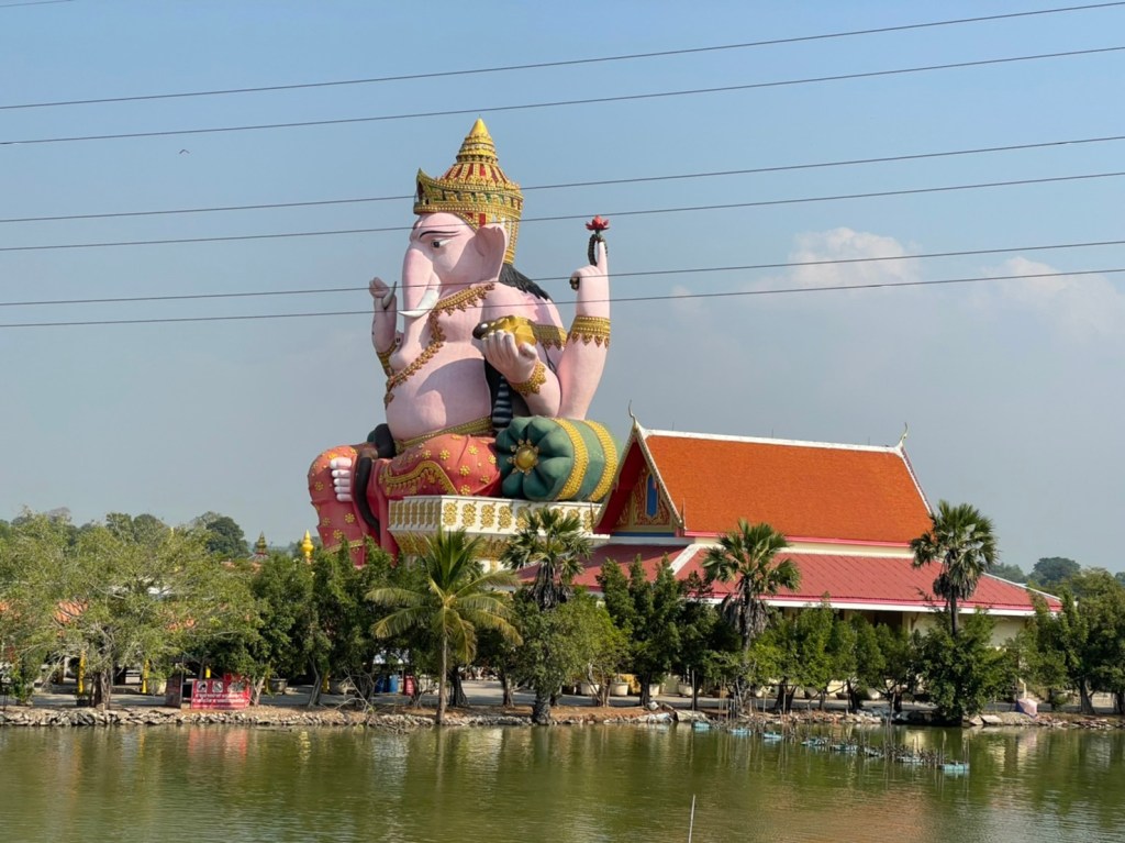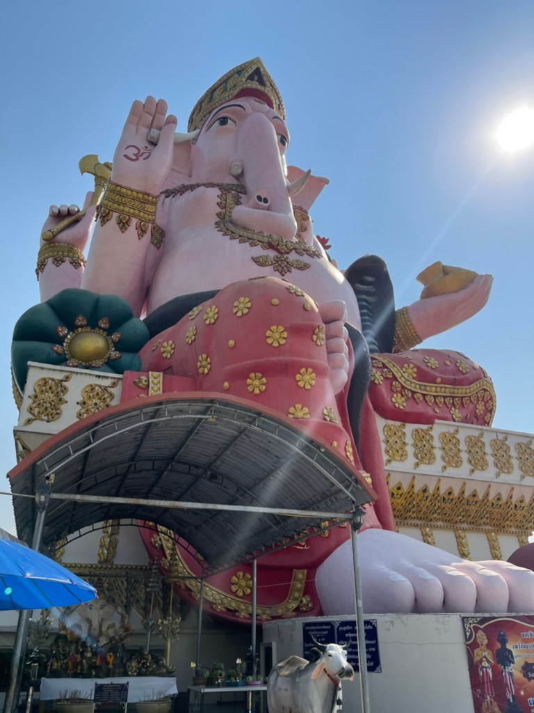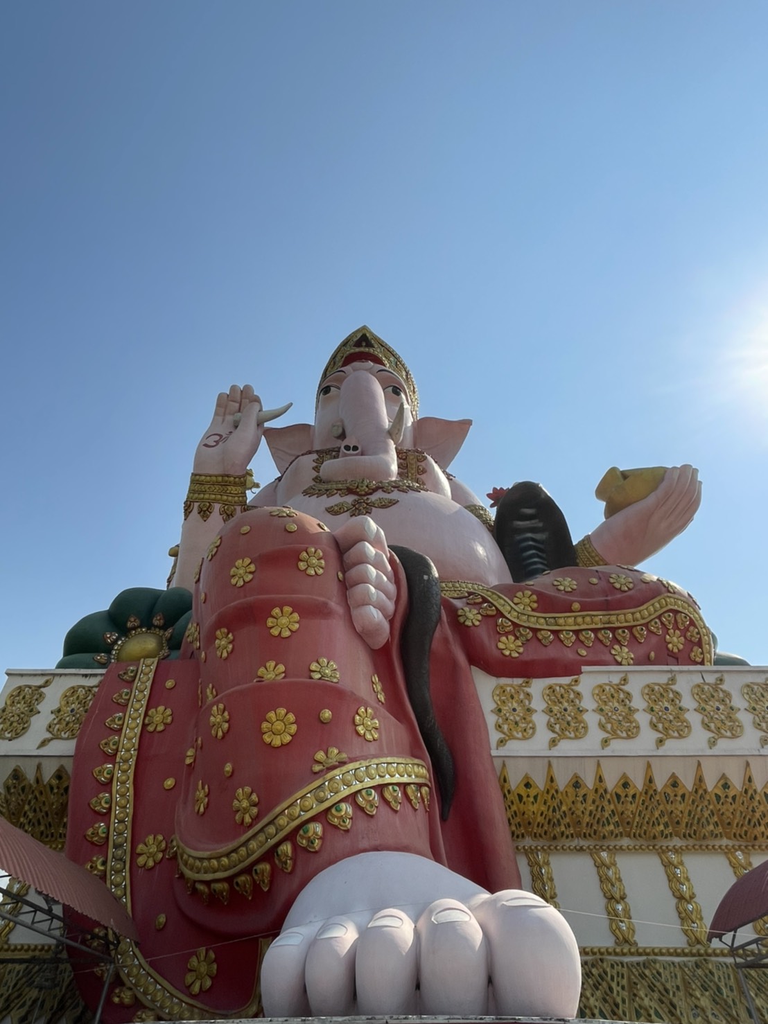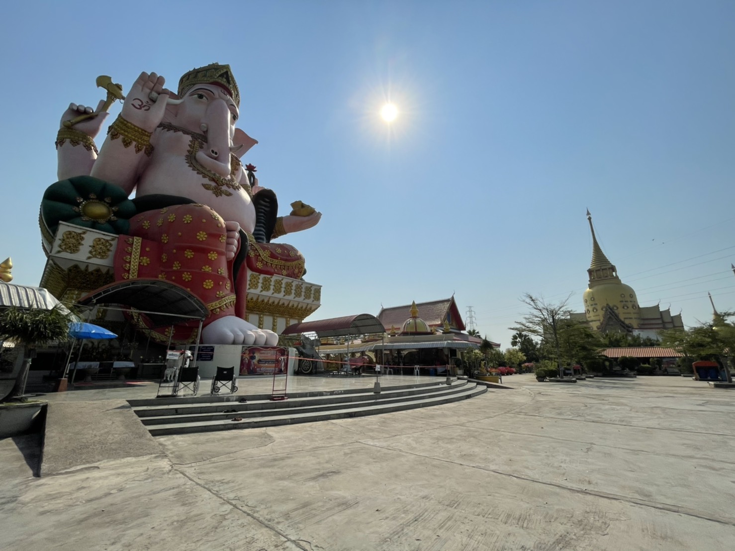องค์พระพิฆเนศ ปางนั่งประธานพร นั่งอยู่บนตั่ง มีความสูง 49 เมตร ไม่รวมฐาน และกว้าง 19 เมตร ผิวเนื้อเป็นสีชมพู มีหัตถ์ทั้งหมด 4 กร มีงูใหญ่สีดำอยู่ข้างเอว บนศีรษะสวมพระมาลา (หมวก) ด้านหน้าหมวกมีพระพุทธรูปประดิษฐานอยู่ คือ องค์หลวงพ่อโสธรจำลอง ขนาดหน้าตักกว้าง 60 นิ้ว ส่วนข้างเท้าด้านล่างมีรูปปั้นหนูซึ่งมีความเชื่อว่าเป็นบริวาร เมื่อกราบไหว้เสร็จแล้ว กิจกรรมที่นิยมทำ คือ “กระซิบหูหนู” โดยขอพรจากองค์พระพิฆเนศให้หนูซึ่งเป็นบริวารนำข้อความไปบอก