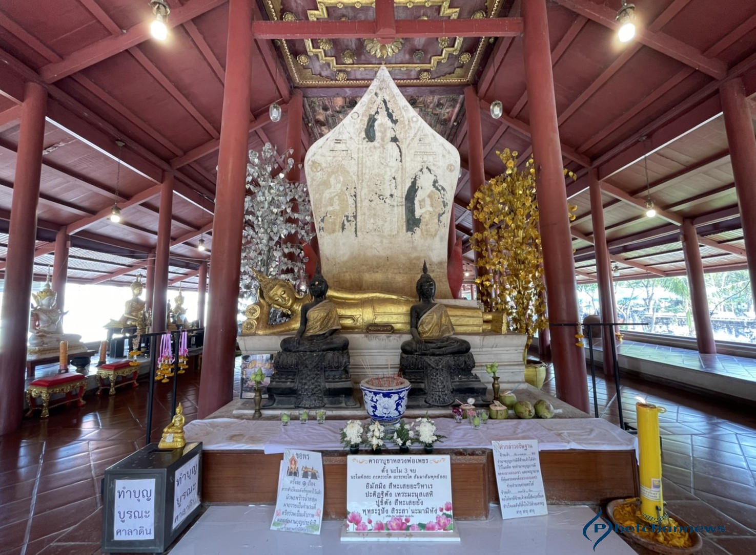 “หลวงพ่อเพชร” พระพุทธรูปปางไสยาสน์ ประจำทิศใต้ ประดิษฐานอยู่ด้านหลังหลวงพ่อโตในศาลาดิน ซึ่งมีซุ้มเรือนแก้วคั่น องค์พระมีขนาดยาว 5 ศอก 1 คืบ 5 นิ้ว อยู่บนฐานชุกชี ด้านหน้าองค์หลวงพ่อเพชรมีพระพุทธรูปปางมารวิชัย ประดิษฐานบนฐานชุกชีสององค์ ส่วนฉากด้านหลังซุ้มเรือนแก้วปรากฎภาพจิตรกรรมฝาผนังศิลปสมัยอยุธยา วาดเป็นภาพพระพุทธเจ้าเสด็จจากดาวดึงส์ แต่รายละเอียดของภาพถูกน้ำฝนชะล้างไปจนเลือนราง ซึ่งเป็นภาพจิตรกรรมที่เก่าที่สุดในจังหวัดปทุมธานีที่ยังคงหลงเหลืออยู่ปัจจุบัน