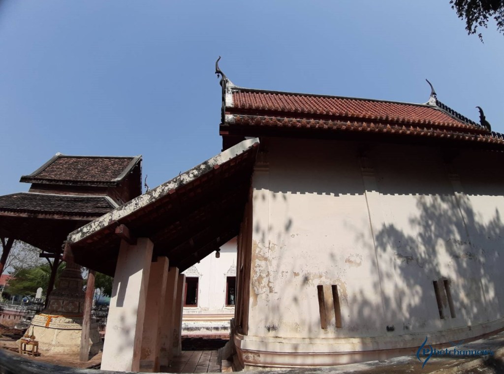 หันหน้าไปทางทิศตะวันตกเป็นอาคารรูปทรงสี่เหลี่ยมขนาดเล็ก จำนวน 3 ห้อง หรือ 3 ช่วงเสา กว้าง 5.37 เมตร ยาว 7.86 เมตร ความหนาผนังประมาณ 60 เซนติเมตร ผนังสกัดหน้ามีประตูทางเข้า 1 ช่อง ส่วนด้านหลังเจาะเป็นช่องแสง บริเวณกึ่งกลางของอาคาร และด้านข้างอาคารมีการเจาะช่องแสงด้านละ 3 ช่อง โครงสร้างอาคารเป็นแบบผนังรับน้ำหนักลักษณะหลังคาเป็นผืนเดียวและมีการลดระดับของหลังคาเป็น 2 ตับ มุงด้วยกระเบื้องดินเผากาบู ด้านหน้าอาคารมีการก่อเฉลียงยื่นออกมา ลักษณะฐานอาคารแอ่นสำเภา เป็นฐานบัวลูกแก้วหน้าต่าง มีช่องประตูเข้าทางเดียว วงกบประตูทำด้วยไม้สักทอง บานประตูมีความหนามาก