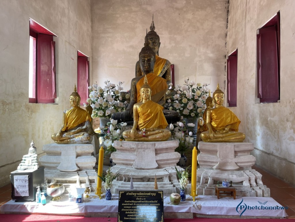 ภายในอุโบสถ เป็นที่ประดิษฐานของ “หลวงพ่อพุทธรัตนมุนี” พระประธานประจำทิศตะวันออก ประดิษฐานภายในพระอุโบสถ และพระประธานองค์รวมทั้งพระลำดับอีกสามองค์ พระประธานปูนปั้นปางมารวิชัย พระพักตร์รูปไข่ พระขนงโก่งโค้ง พระนาสิกโด่ง พระโอษฐ์ยิ้ม พระกรรณยาว พระเกศาเป็นเม็ดละเอียด พระรัศมีเป็นเกศเปลว พระวรกายบอบบางสวยงามตามรูปแบบศิลปสมัยอยุธยา หน้าตักกว้าง 5 ศอก สูง 6 ศอก พร้อมด้วยพระอู่ทองรายล้อม ฐานชุกชีส่วนบนทำเป็นบัวกลุ่มกลีบใหญ่รองรับเป็นฐานปัทม์ย่อมุมขยายจนจดแท่น ส่วนพระพุทธรูปองค์รองมีรูปทรงเช่นเดียวกัน