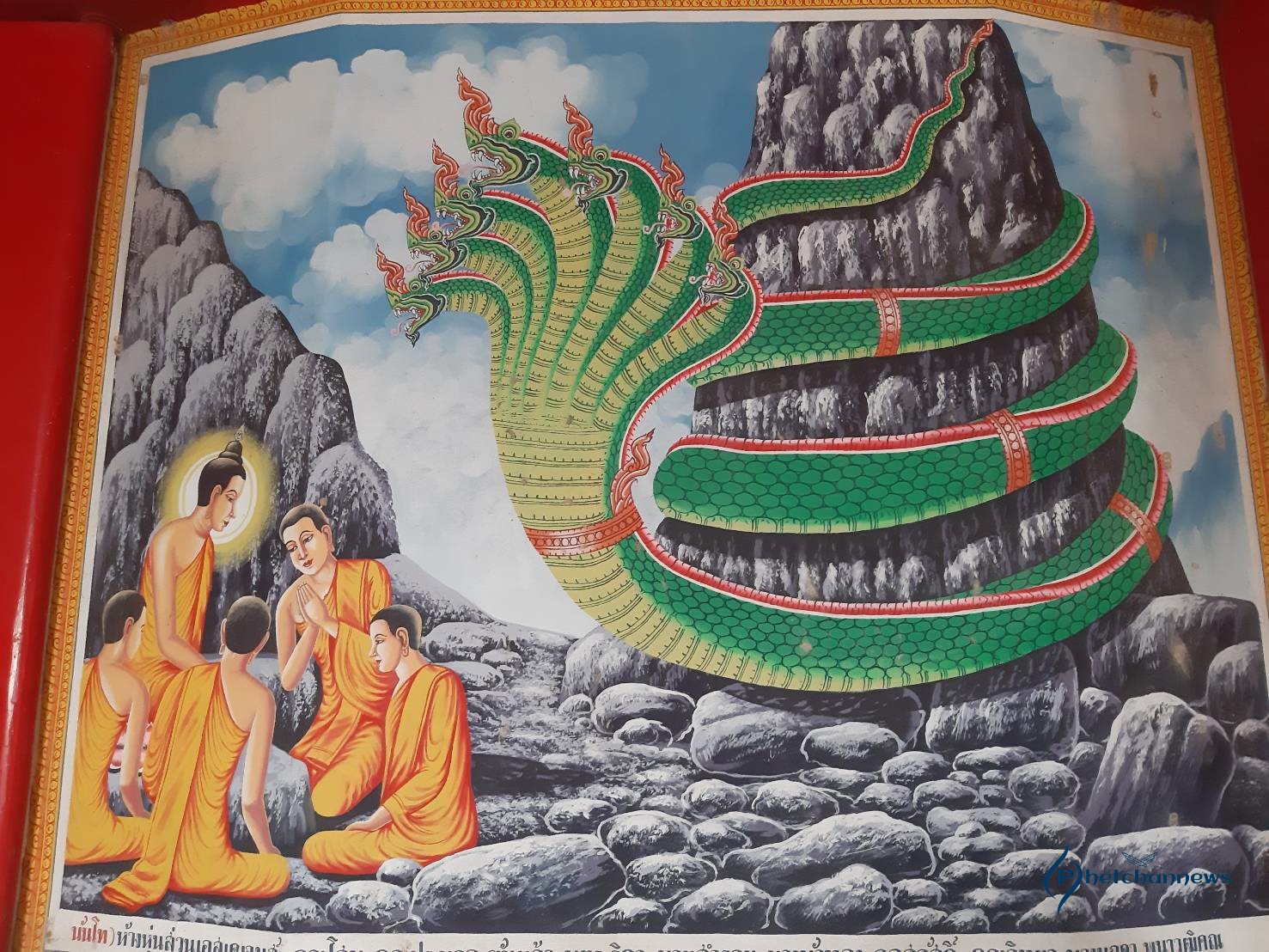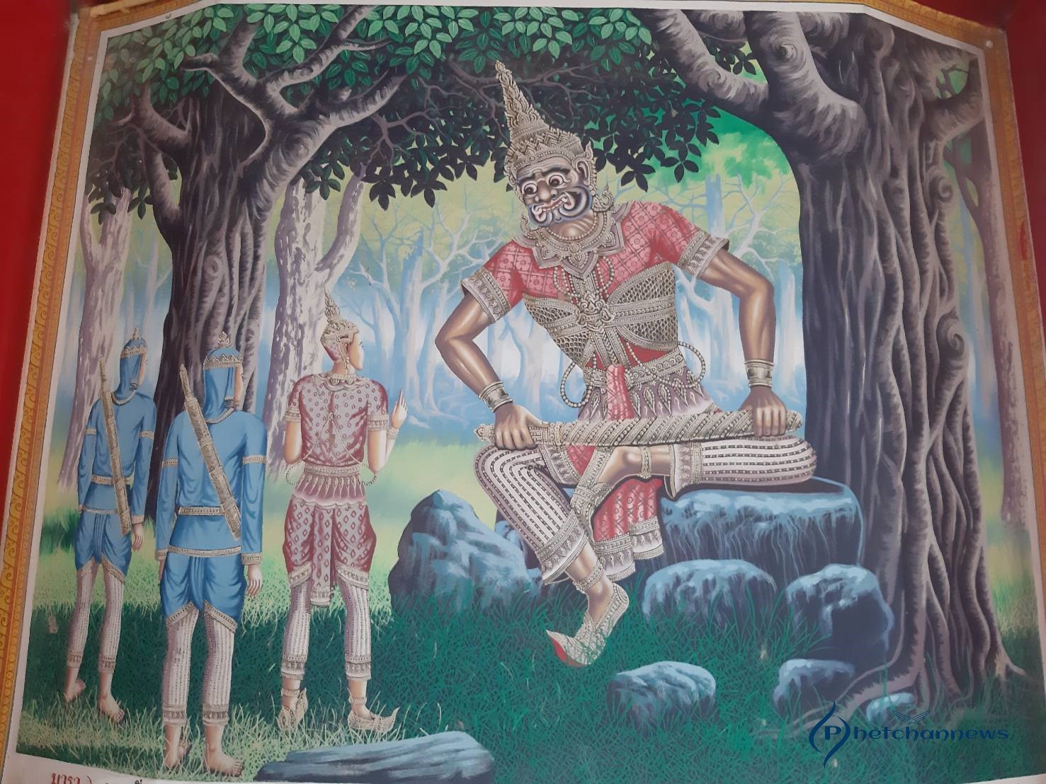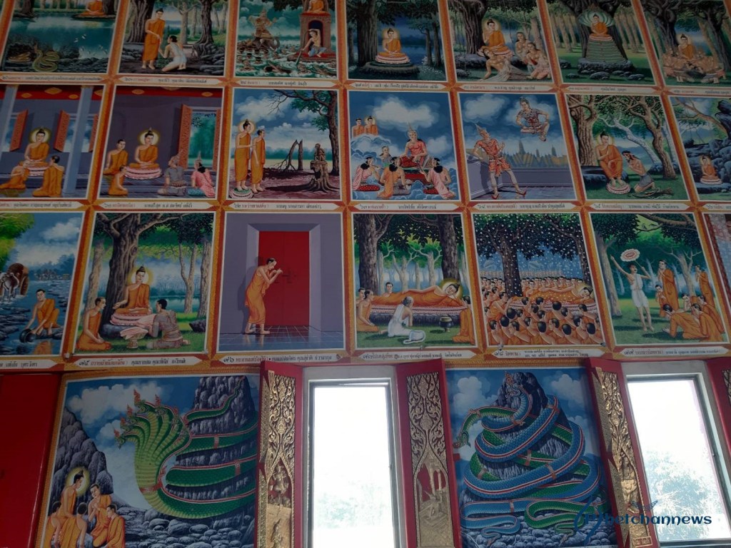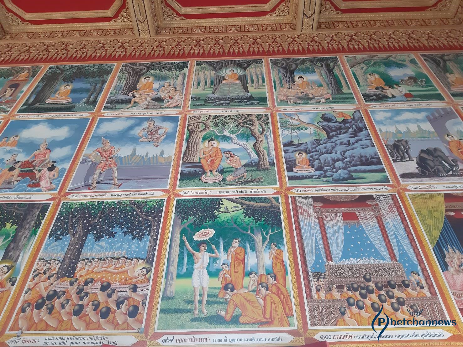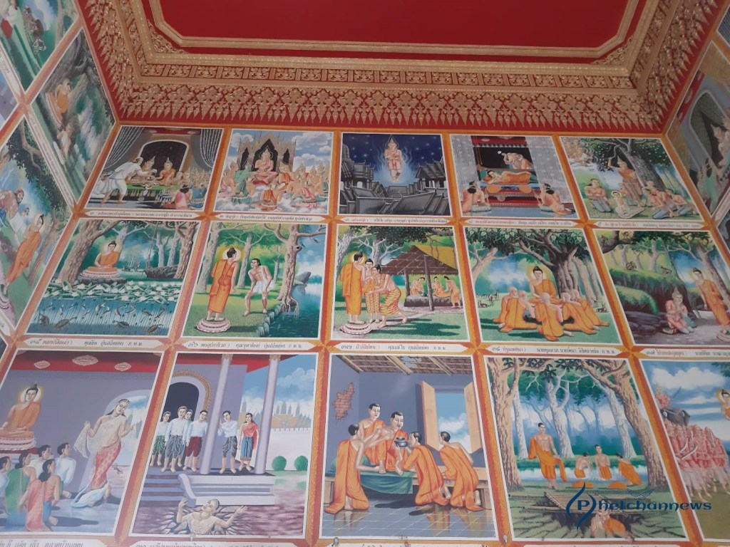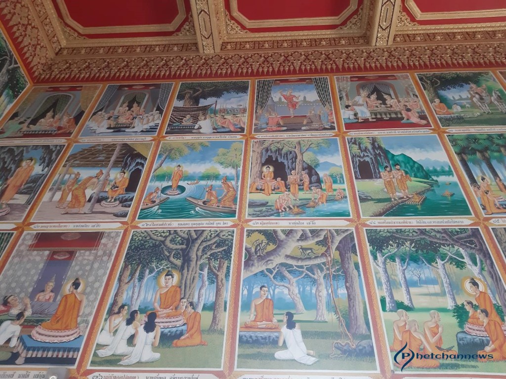 วันที่ 8 ธันวาคม พ.ศ.2525 หลวงพ่อเกษมได้เดินทางมาปักกลด ณ วัดม่วง และได้หล่อปั้นพระพุทธรูปศิลาแลง “หลวงพ่อขาว” ให้เต็มองค์ห่อหุ้มองค์ศิลาแลงไว้ข้างใน และสร้างวัดม่วงขึ้นมาให้เป็นที่รู้จัก หนึ่งในนั้น คือ พระอุโบสถกลีบดอกบัว ที่มีความงดงามของจิตรกรรมฝาผนัง