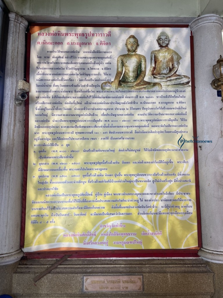 ตามประวัติ “หลวงพ่อหิน” จากหนังสือพิจิตรของเรา กล่าวไว้ว่า กรมหลวงชุมพรเขตอุดมศักดิ์ พระราชโอรสในพระบาทสมเด็จพระจุลจอมเกล้าเจ้าอยู่หัว เสด็จไปนมัสการหลวงพ่อเงิน ที่วัดหิรัญญาราม อ.โพทะเล จ.พิจิตร เมื่อกลับมาจากนมัสการหลวงพ่อเงินแล้ว ได้แวะนมัสการหลวงพ่อหินที่วัดการ้อง (วัดการ้องเป็นวัดเก่าแก่ตั้งอยู่ริมแม่น้ำน่าน ฝั่งตะวันตกตรงข้ามกับวัดท่าช้างปัจจุบัน วัดนี้พังลงมาหมดแล้วเพราะน้ำกัดเซาะ จึงเหลือแต่ชื่อวัด) พระองค์พอพระทัยในหลวงพ่อหินมากเห็นเศียรหลวงพ่อหินหักตกอยู่ข้างองค์หลวงพ่อหิน จึงได้ขอเศียรหลวงพ่อหินไปไว้ที่พิพิธภัณฑ์สถานแห่งชาติ ต่อมาราวปี พ.ศ.2480 ชาวบ้านจึงได้สร้างเศียรหลวงพ่อหินต่อเติมขึ้นใหม่ แล้วนำหลวงพ่อหินมาประดิษฐานที่วัดท่าช้าง ต.เนินมะกอก อ.บางมูลนาก ซึ่งตั้งอยู่ริมแม่น้ำน่านฝั่งตะวันออก ห่างจากที่ว่าการอำเภอบางมูลนากประมาณ 2 กิโลเมตร ปัจจุบันหลวงพ่อหินประดิษฐานอยู่ในมณฑปหลังใหม่ ที่ชาวบ้านร่วมกันสร้างขึ้นใหม่