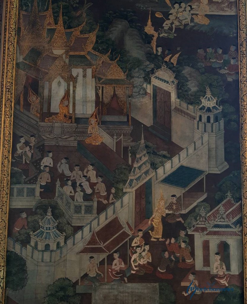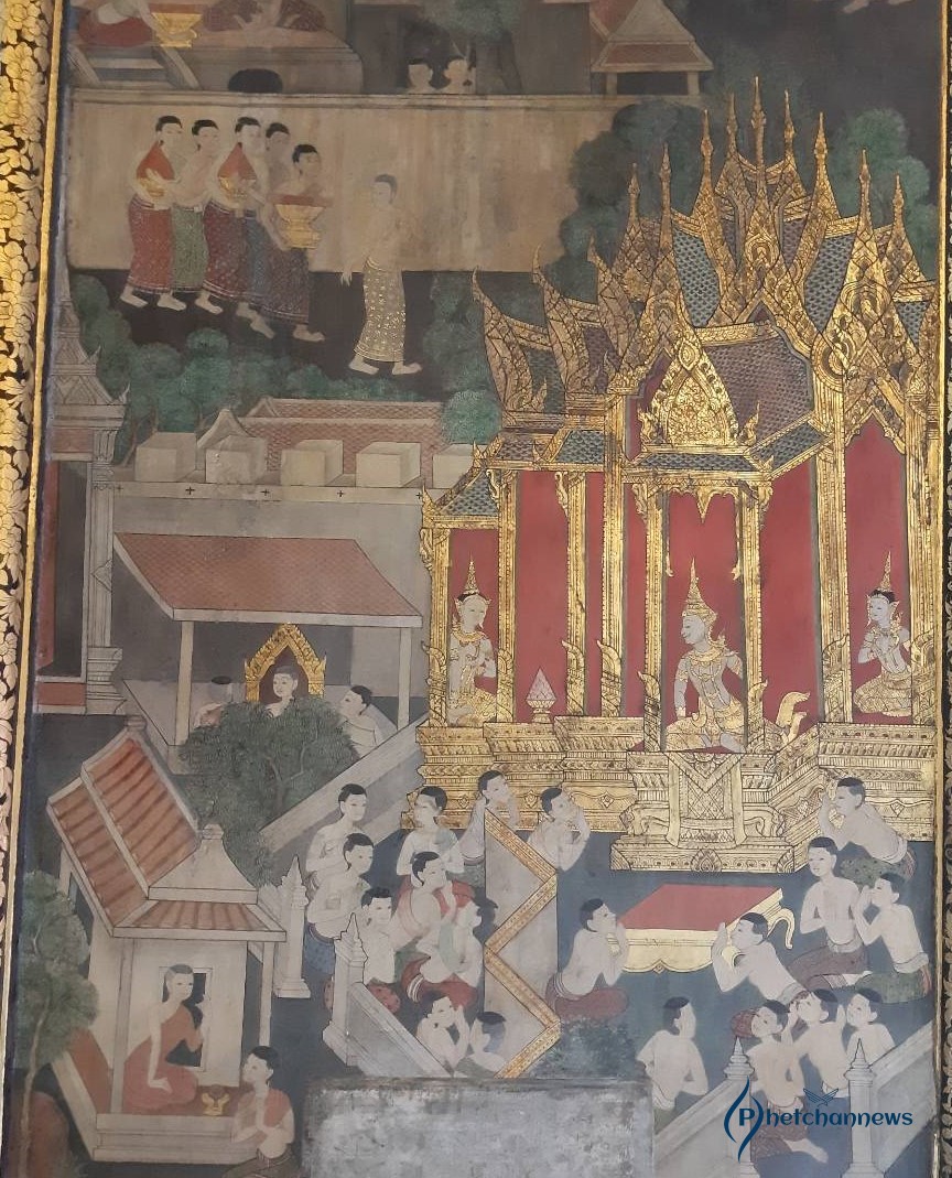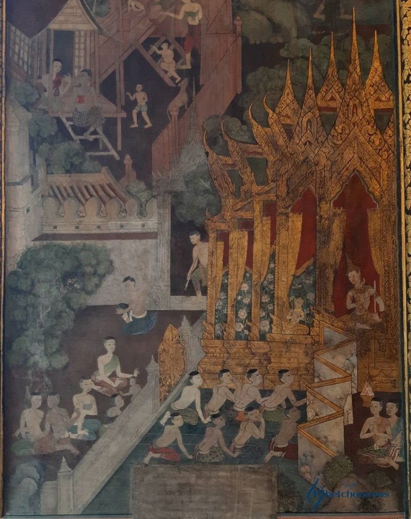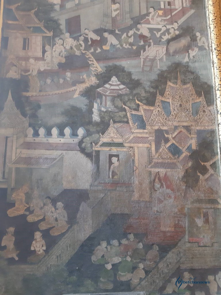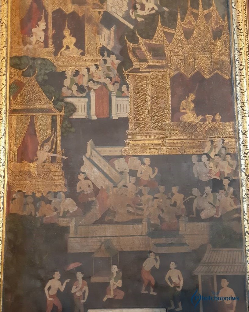ในวิหารพระพุทธไสยาสน์ ภาพจิตรกรรมฝาผนังส่วนเหนือช่องหน้าต่างทั้ง 4 เป็นเรื่องคัมภีร์มหาวงศ์หรือพงศาวดารของลังกาทวีป การประดิษฐานพระพุทธศาสนาในลังกาทวีปหรือเกาะศรีลังกา ซึ่งเป็นต้นทางพระพุทธศาสนาก่อนเข้ามาเจริญในประเทศไทย