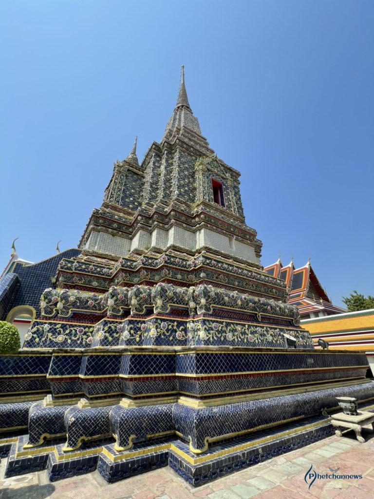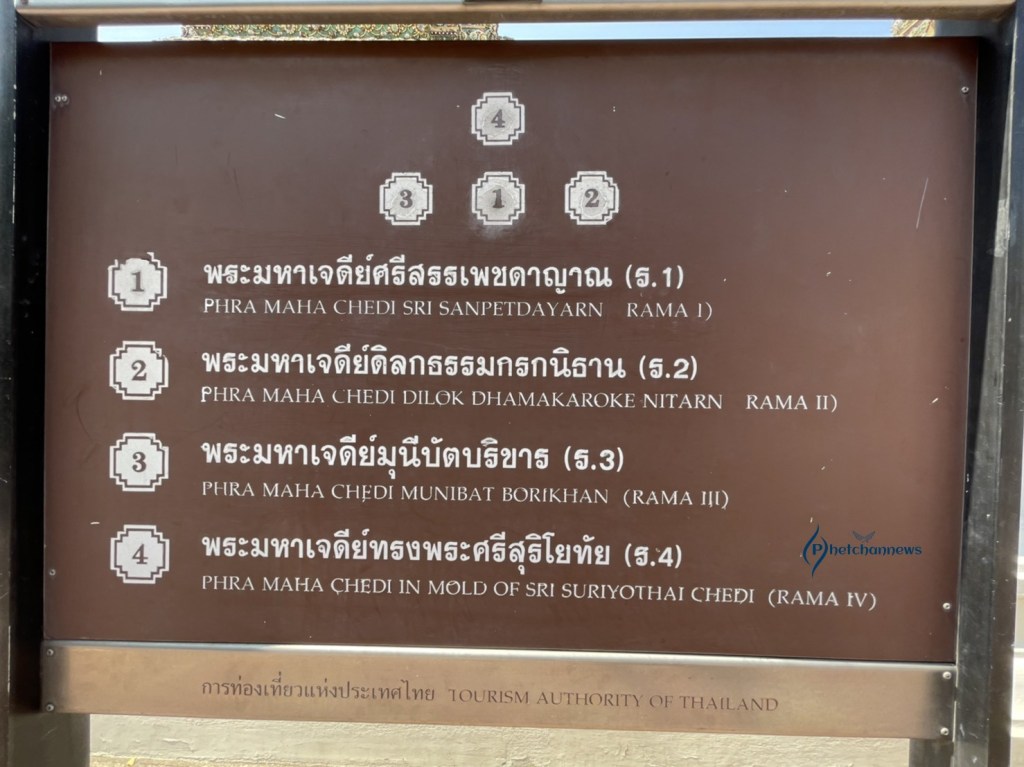 -พระมหาเจดีย์รัชกาลที่ 4 คือ พระมหาเจดีย์ด้านทิศตะวันตก ประดับกระเบื้องเคลือบสีขาบ (สีน้ำเงินเข้ม) นามว่า “พระมหาเจดีย์ทรงพระศรีสุริโยทัย” สร้างในสมัยรัชกาลที่ 4 เพื่อพระราชอุทิศถวายเป็นพระพุทธบูชา