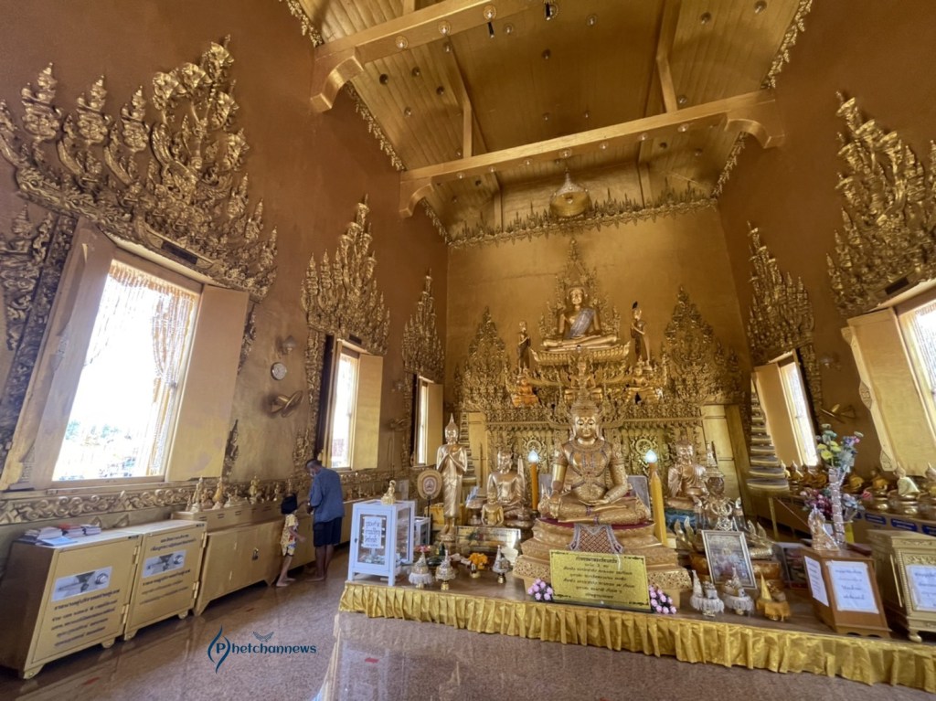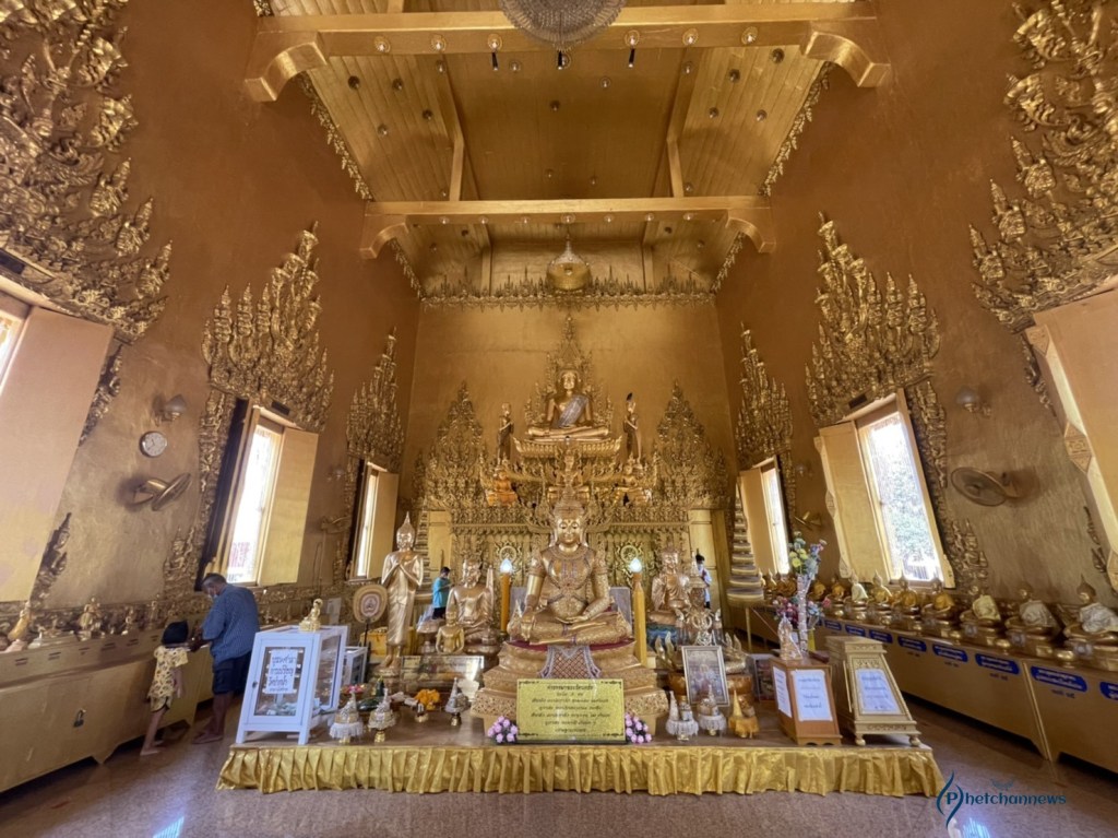 ภายในพระอุโบสถทาสีทองทั้งหมด ผนังไม่ได้วาดเป็นจิตรกรรมฝาผนังแต่ใช้การประดับกรอบประตู หน้าต่างด้วยลวดลายปูนปั้นแทน และเปิดให้ลอดใต้ฐานพระประธานเพื่อความเป็นสิริมงคล โดยบริเวณทางเข้าจะหลบมุมต้องเดินเข้าไปใกล้จึงจะรู้ว่ามีทางเดินลอดระยะสั้นๆ อยู่ ด้านในมีพัดลมช่วยระบายอากาศ เวลาเดินให้เดินเข้าทางซ้ายและเดินทะลุออกมายังฝั่งขวาของพระประธาน ขณะลอดก็จะมีบทสวดมนต์ภาวนาอธิษฐานจิตเพื่อให้จิตสงบเป็นสมาธิ
