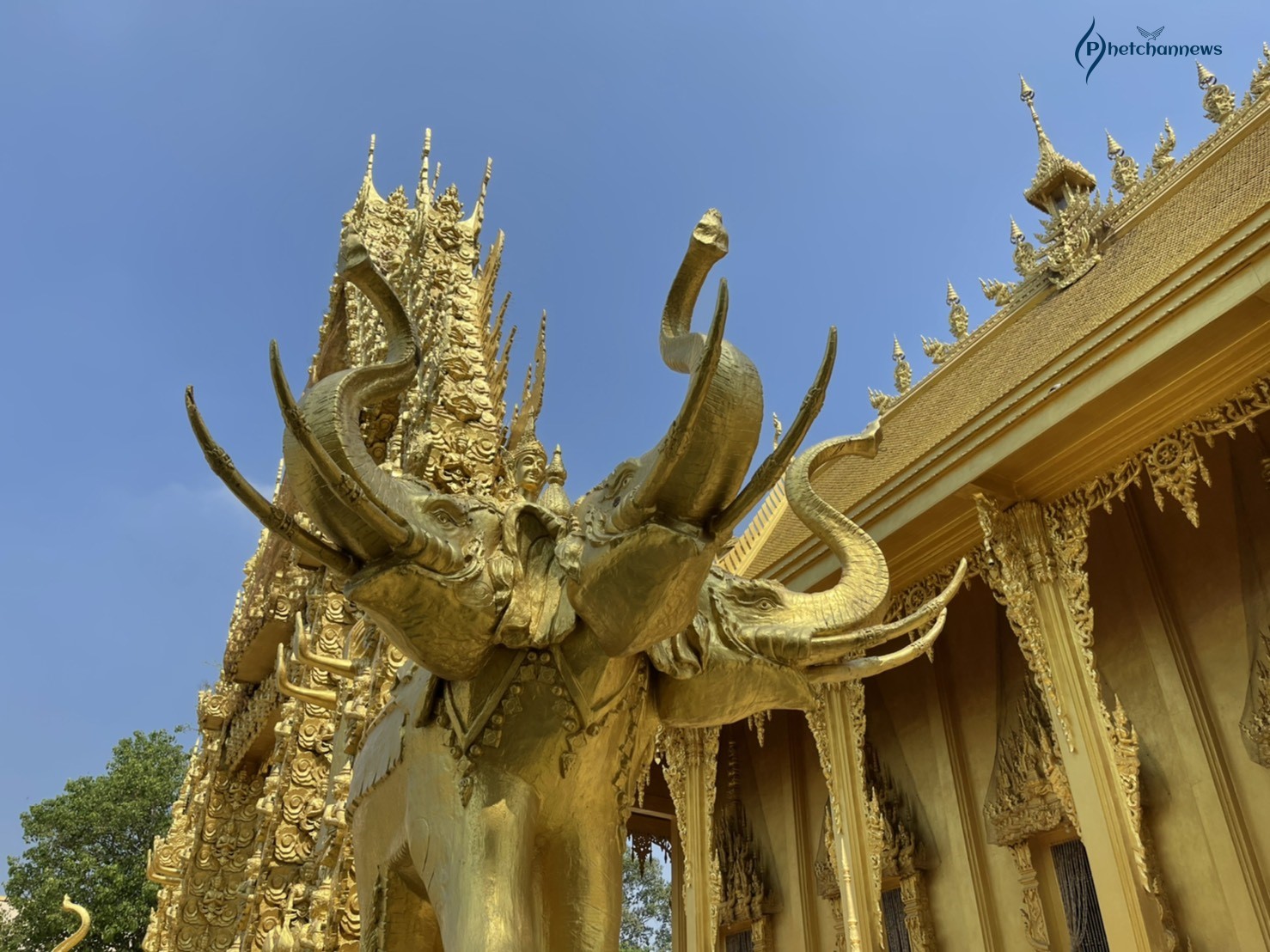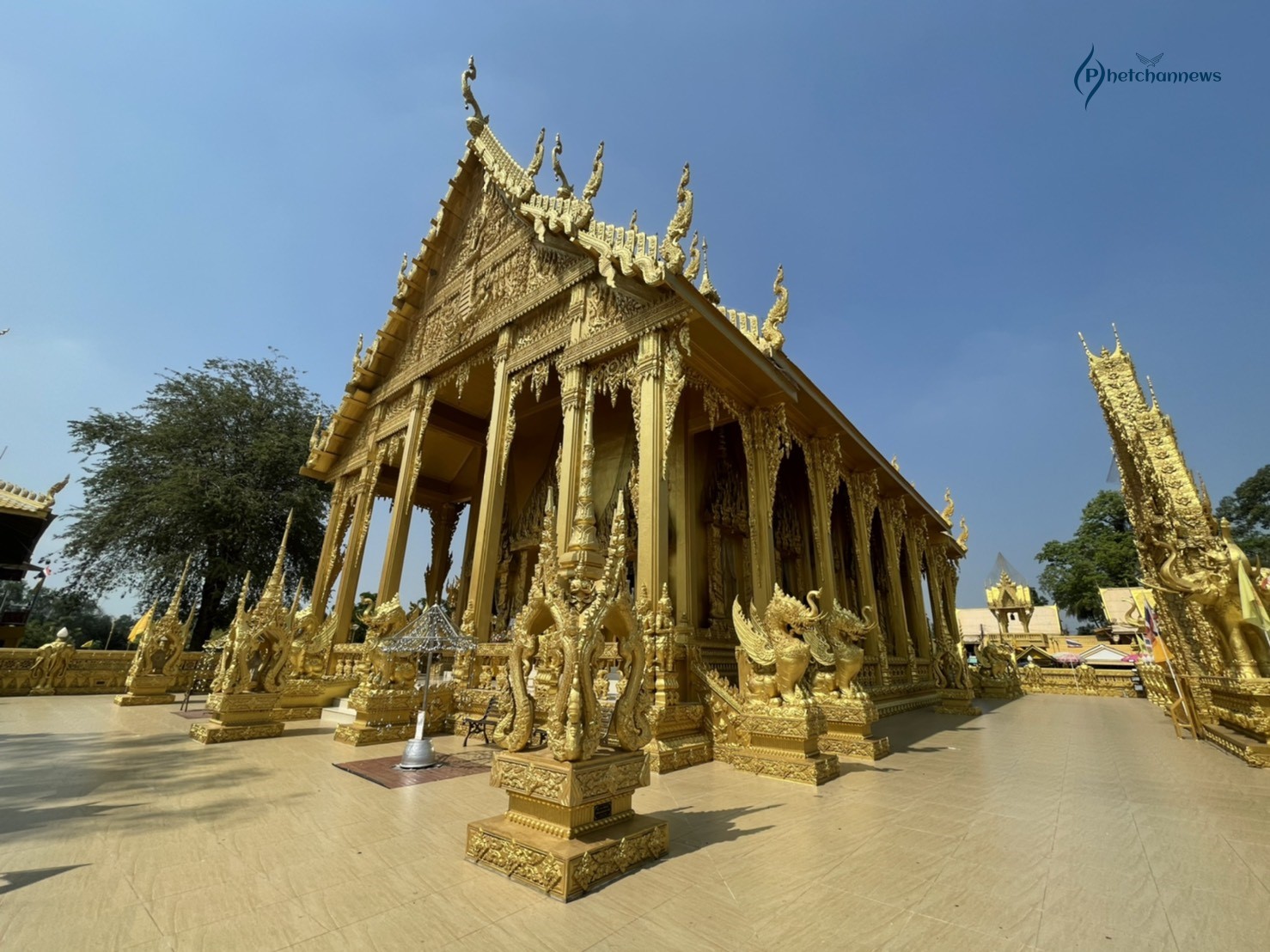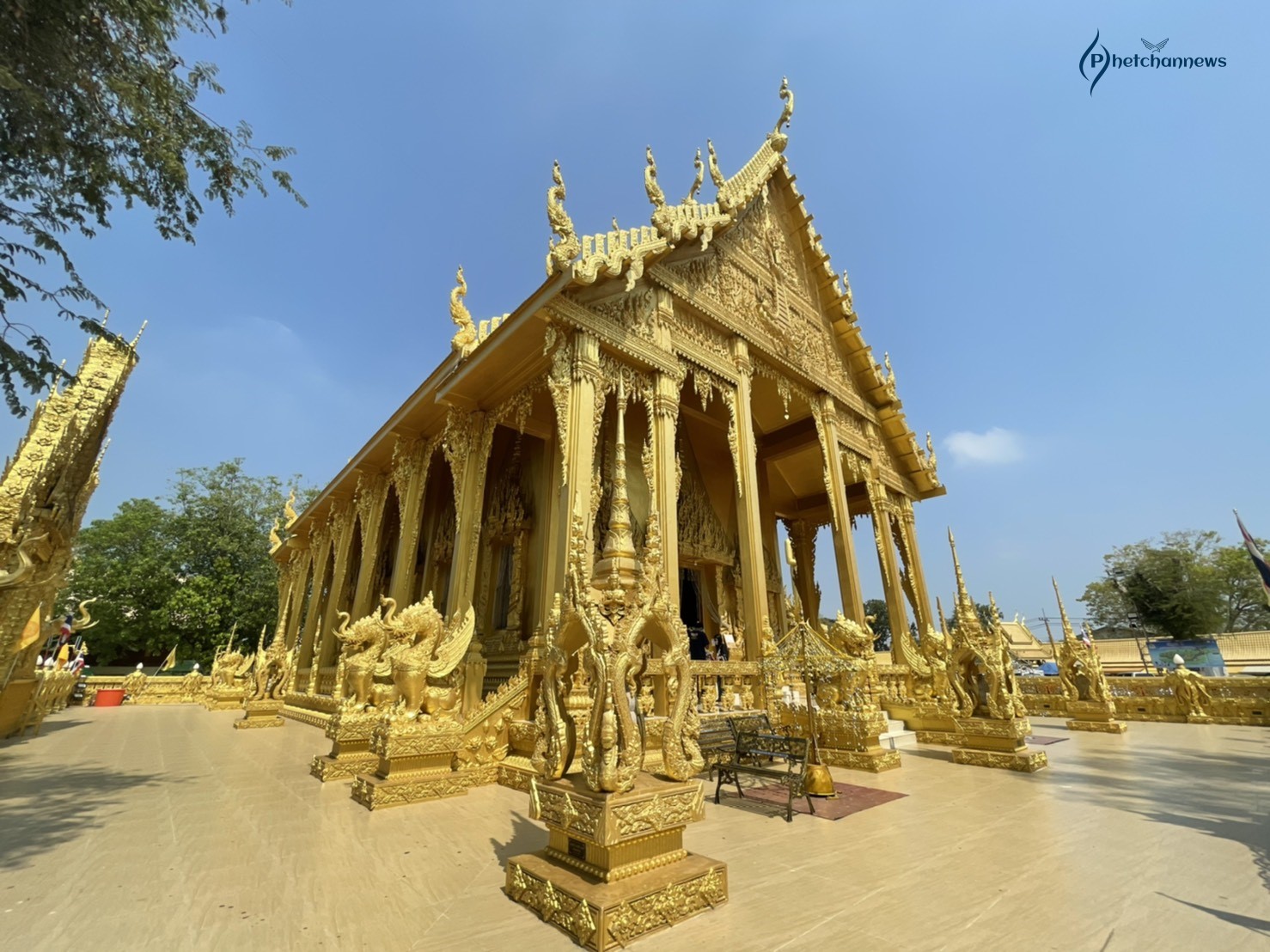“พระอุโบสถสีทอง” เป็นอุโบสถสีทองหนึ่งเดียวในประเทศไทยที่ทาสีทองทั้งหลัง ตัวอุโบสถสร้างแบบก่ออิฐถือปูน หลังคาประดับด้วยพญานาคและธรรมจักรตรงกลางมีบุษบกยอดฉัตร ส่วนบริเวณกำแพงแก้วชั้นนอกตกแต่งด้วยลวดลายธรรมจักรสลับกับโคมไฟรูปช้างสามเศียรเป็นระยะ ๆ