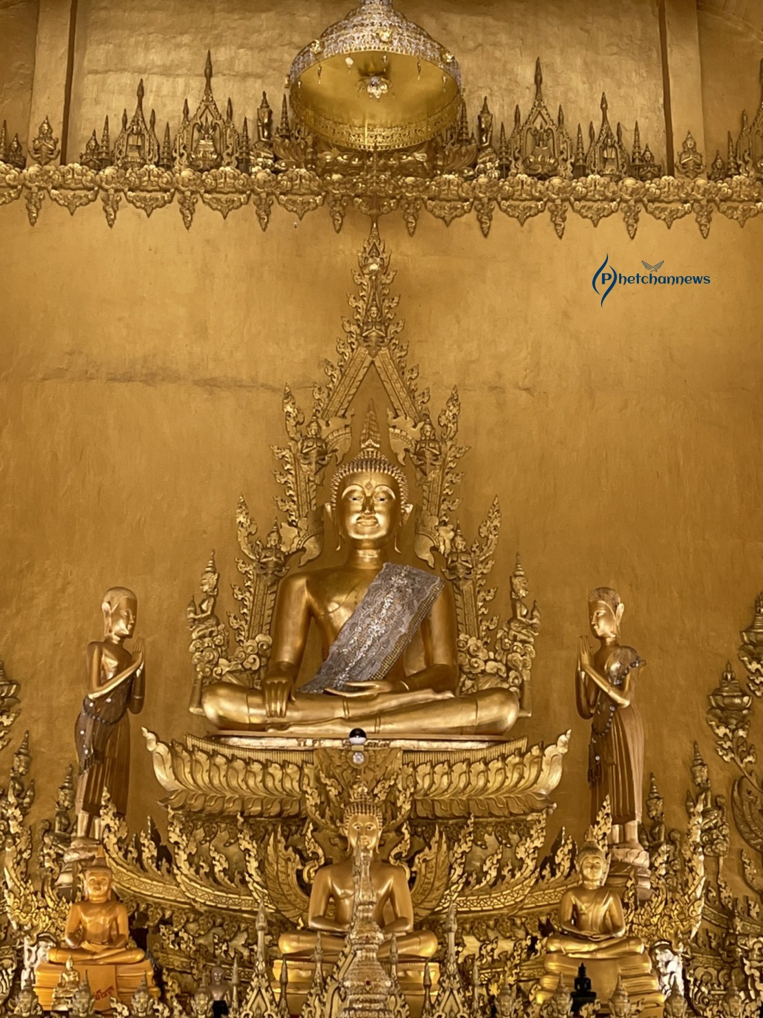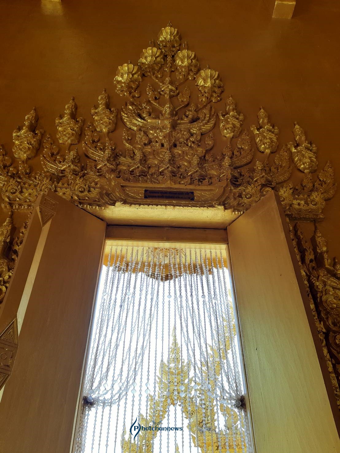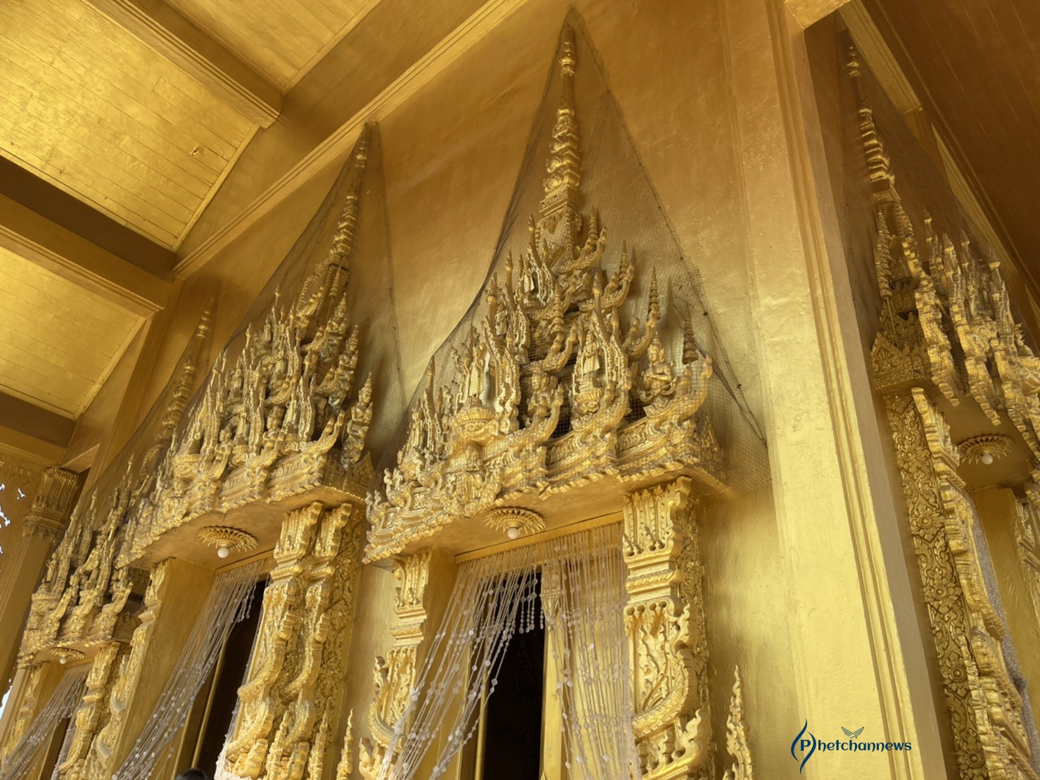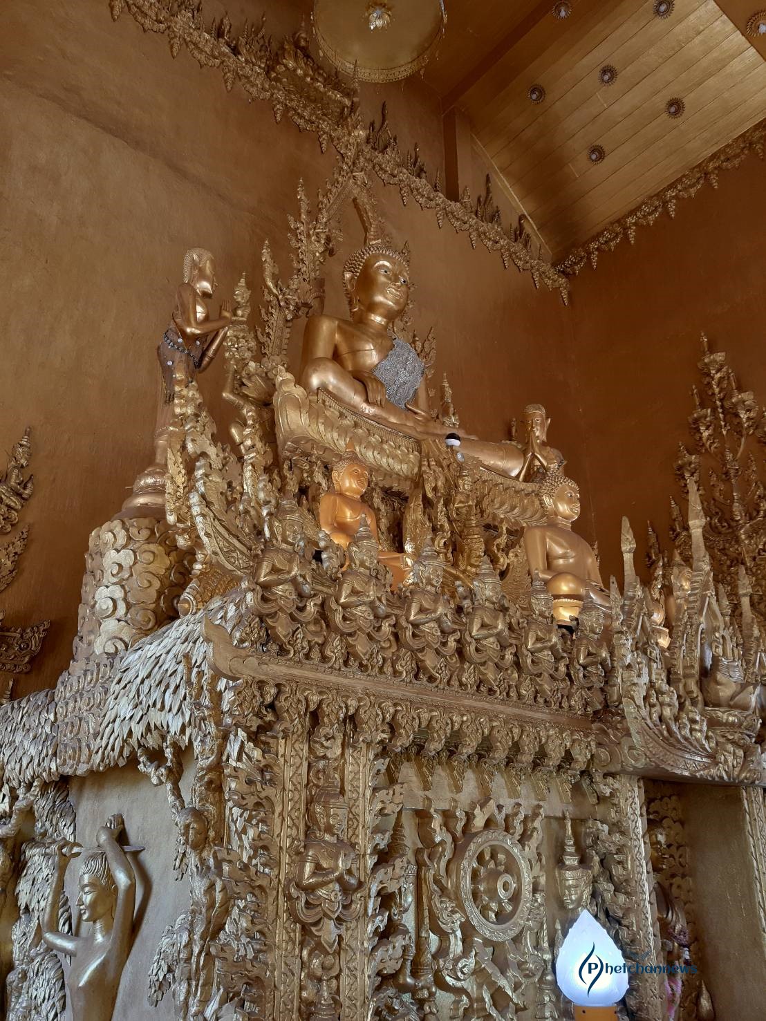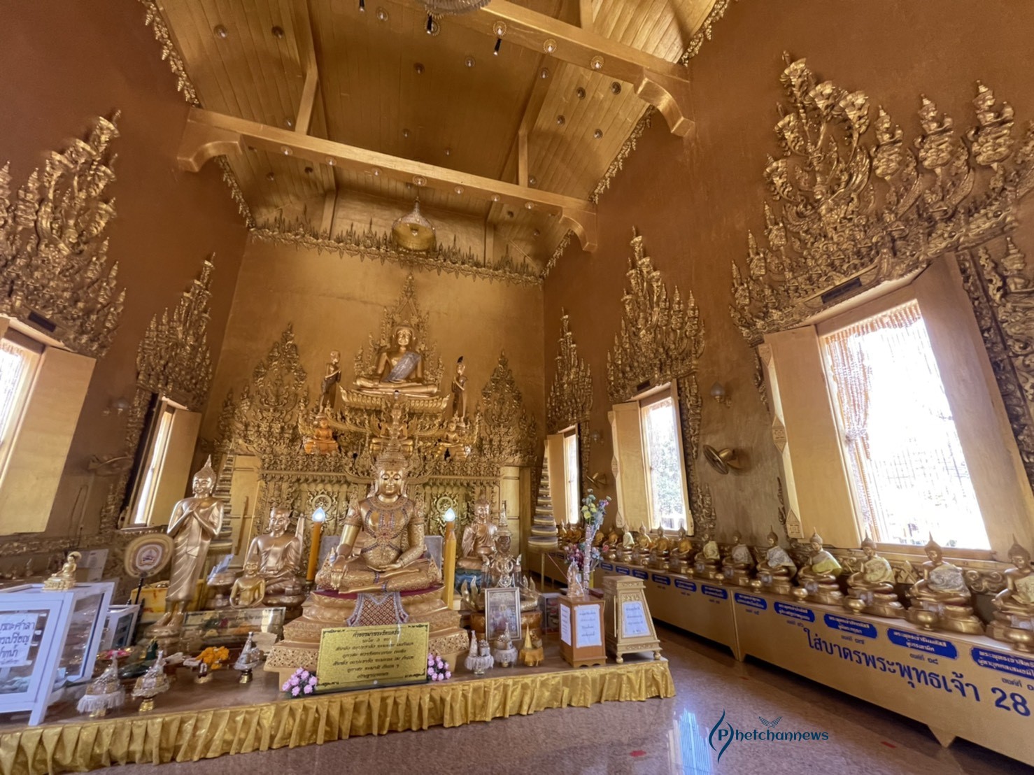 ภายในพระอุโบสถทาสีทองทั้งหมด ผนังไม่ได้วาดเป็นจิตรกรรมฝาผนังแต่ใช้การประดับกรอบประตู หน้าต่างด้วยลวดลายปูนปั้นแทน และเปิดให้ลอดใต้ฐานพระประธานเพื่อความเป็นสิริมงคล โดยบริเวณทางเข้าจะหลบมุมต้องเดินเข้าไปใกล้จึงจะรู้ว่ามีทางเดินลอดระยะสั้นๆ อยู่ ด้านในมีพัดลมช่วยระบายอากาศ เวลาเดินให้เดินเข้าทางซ้ายและเดินทะลุออกมายังฝั่งขวาของพระประธาน ขณะลอดก็จะมีบทสวดมนต์ภาวนาอธิษฐานจิตเพื่อให้จิตสงบเป็นสมาธิ