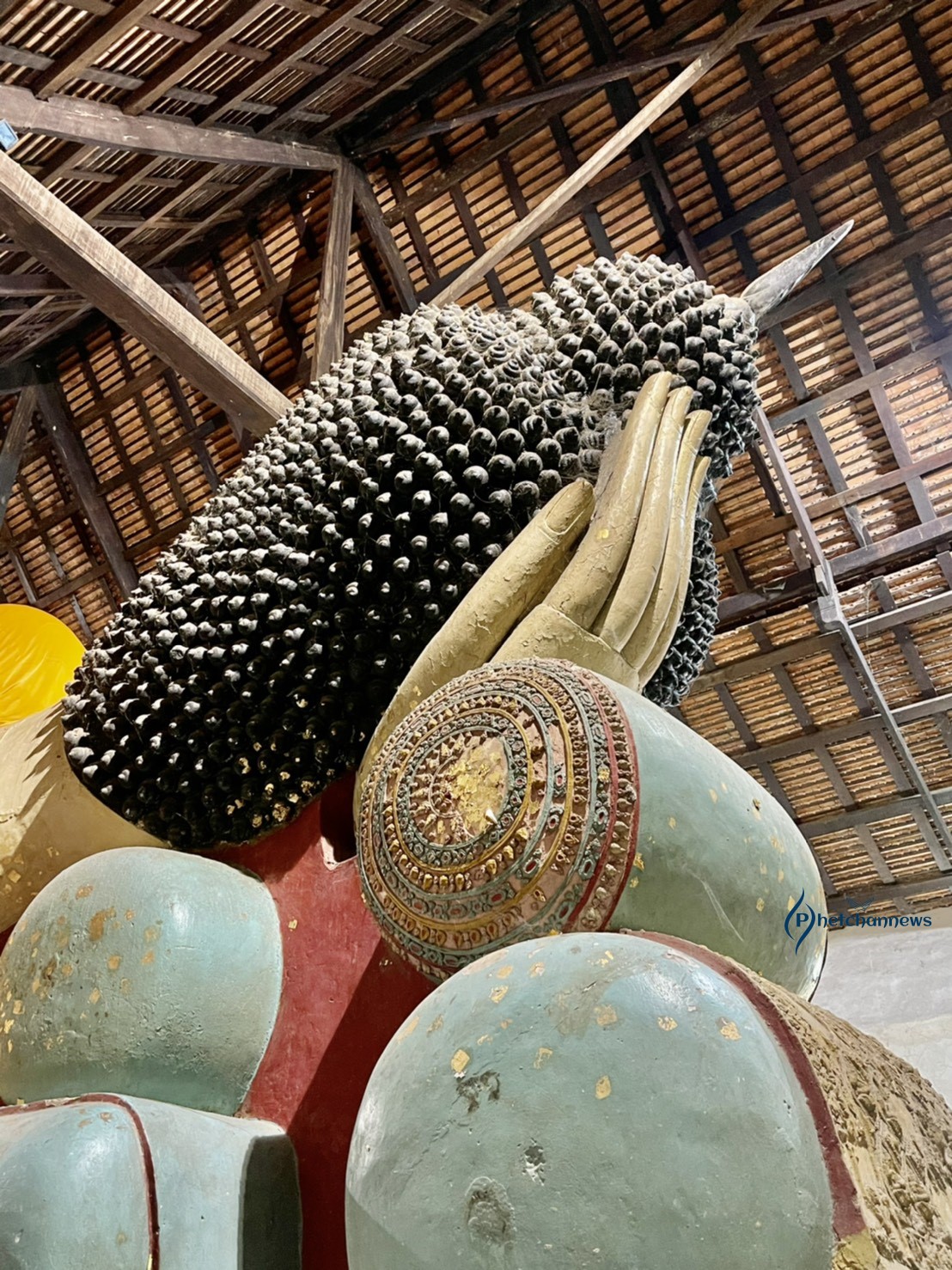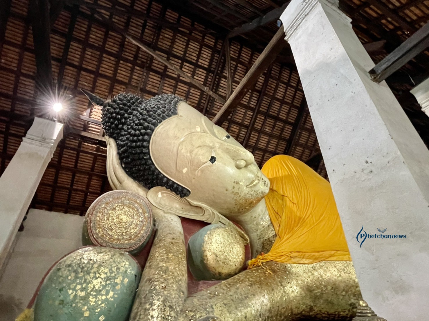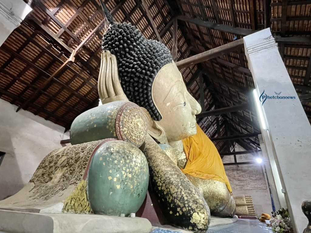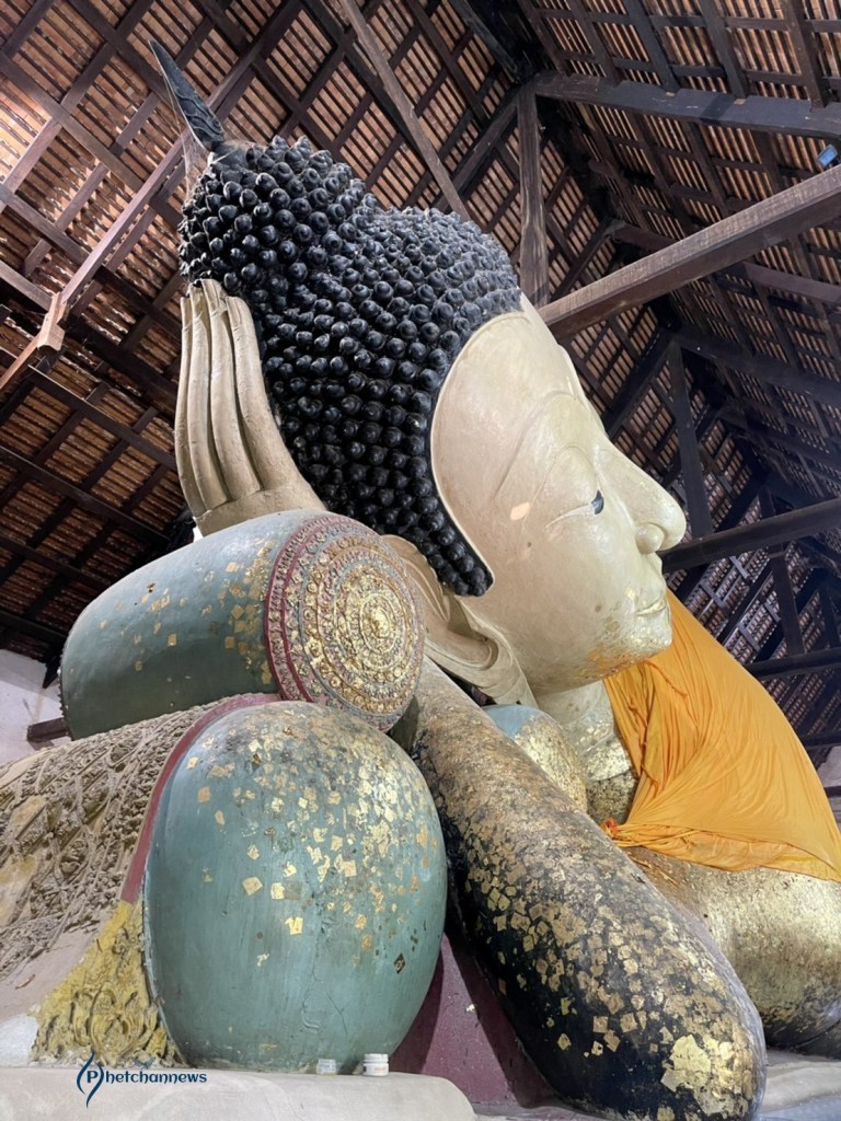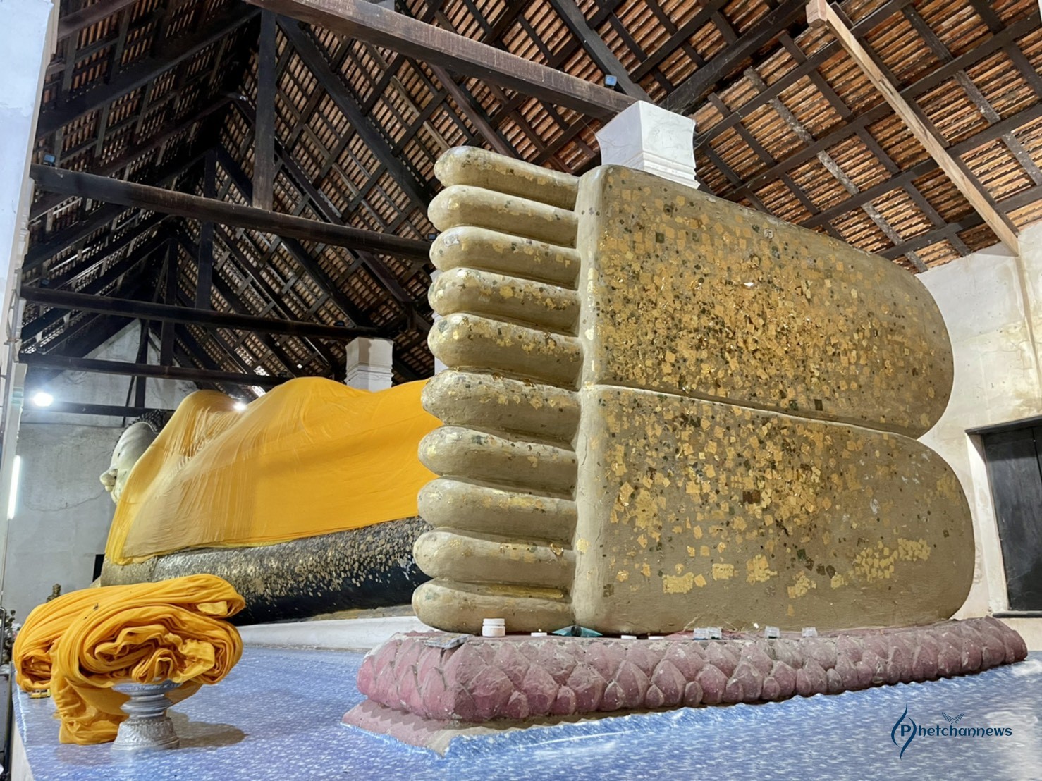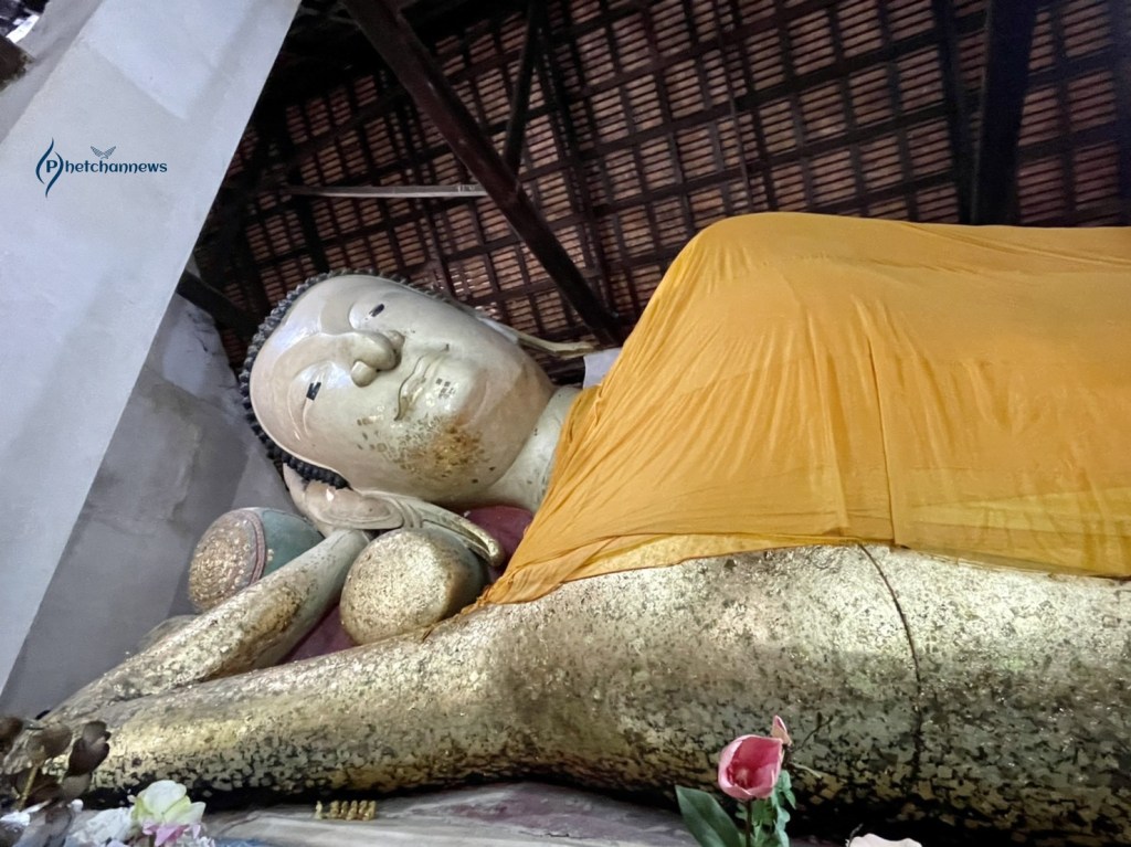 ส่วนเจดีย์หน้าวิหารพระนอน เป็นเจดีย์ทรงเครื่องขนาดย่อม ฐานสูงย่อมุมไม้ยี่สิบ ตั้งอยู่บนฐานประทักษิณย่อมุมไม้สิบสอง พระเจดีย์ประธานตั้งอยู่ตรงกันกับวิหารหลังกลางทิศตะวันออก ลักษณะเป็นเจดีย์ทรงกลม หรือทรงระฆังขนาดใหญ่