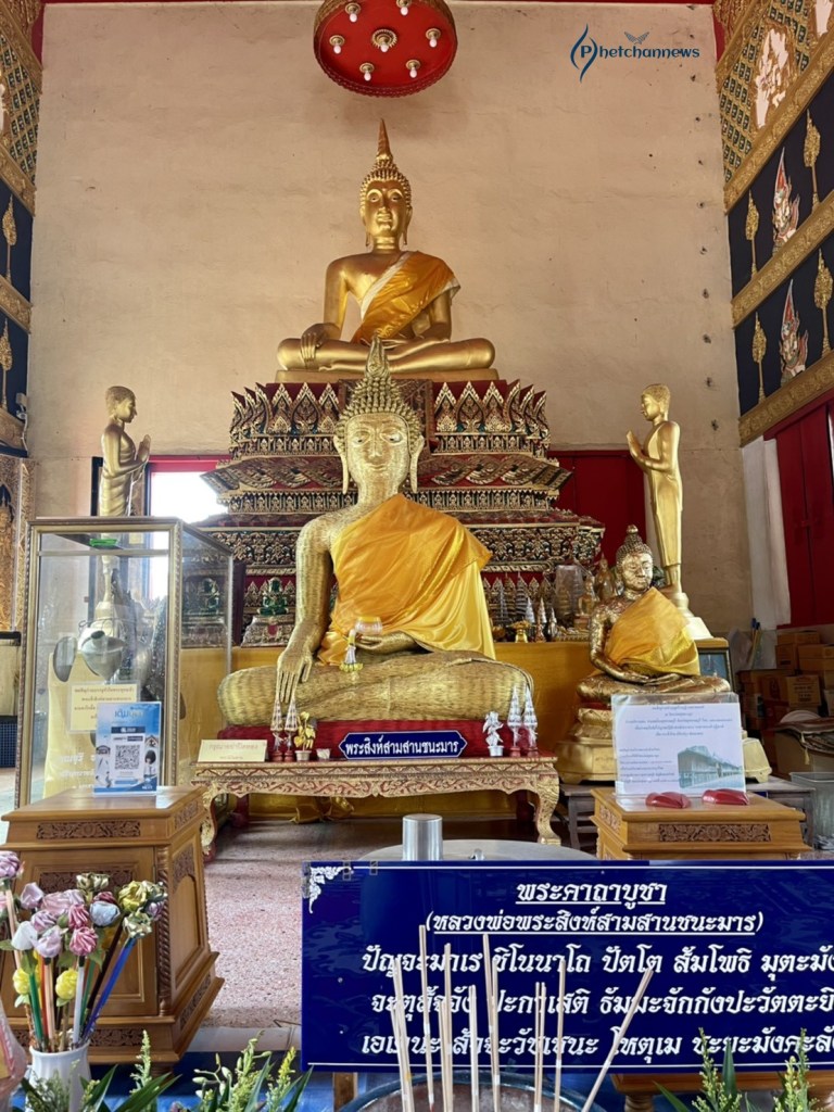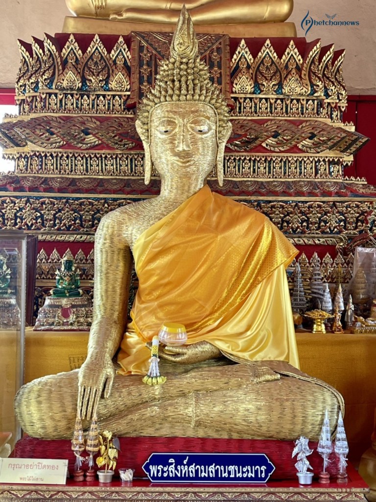 พระสิงห์สามสานชนะมาร เป็นลักษณะพระสิงห์สามเชียงแสน ที่ทำจากไม้ไผ่มุงซึ่งจะมีกิ่งก้านสาขาเลื้อยขึ้นมุงไม้ใหญ่ที่อยู่บริเวณรอบ ๆ คล้ายหวาย เชื่อกันว่ามีลักษณะเหนียวและทนทานเป็นพิเศษ สำหรับไม้ไผ่มุงมีถิ่นกำเนิดจากดอยเมืองโก อำเภอท่าขี้เหล็ก จังหวัดเชียงตุง ประเทศพม่า การตัดและนำลงมาจากยอดดอยสูงต้องใช้เวลาในการเดินทางไปกลับถึง 6 วัน