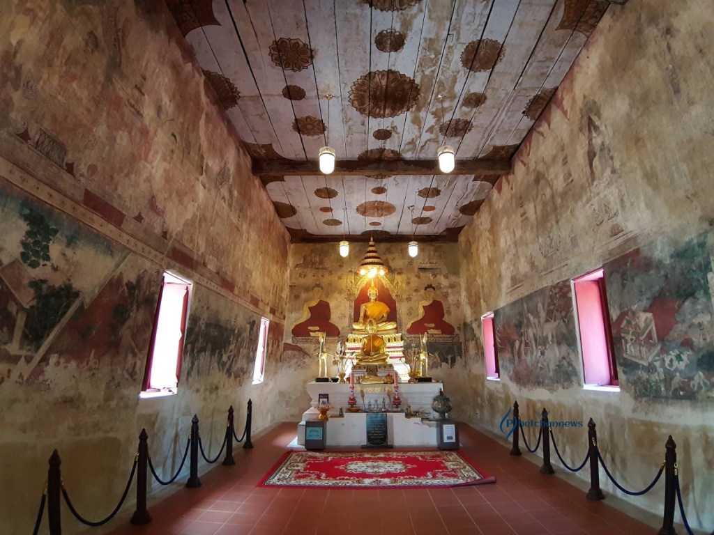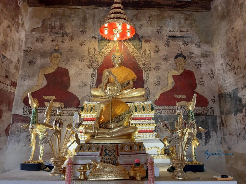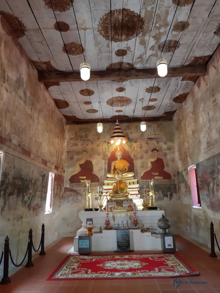 ภายในพระอุโบสถมีภาพจิตรกรรมฝาผนังรูปพระแม่ธรณีบีบมวยผมในท่วงท่าที่อ่อนช้อยงดงามอยู่ในซุ้มเรือนแก้วยอดแหลม ได้รับการยกย่องว่าเป็นภาพแม่พระธรณีที่งดงามที่สุดภาพหนึ่งของเมืองไทย วัดแห่งนี้ได้ขึ้นทะเบียนเป็นโบราณสถานของชาติเมื่อวันที่ 14 พฤษภาคม พ.ศ. 2517