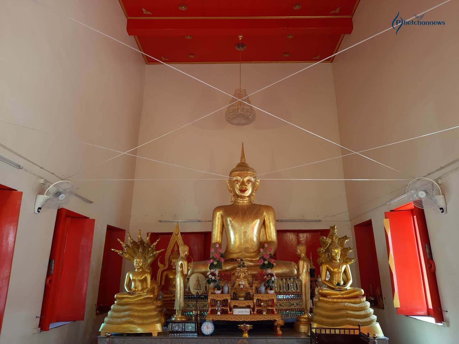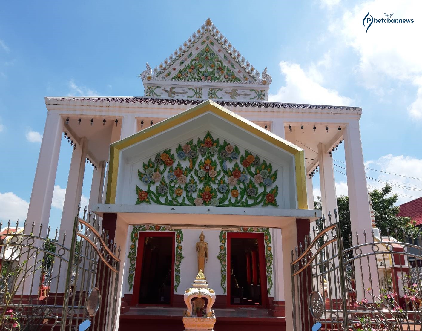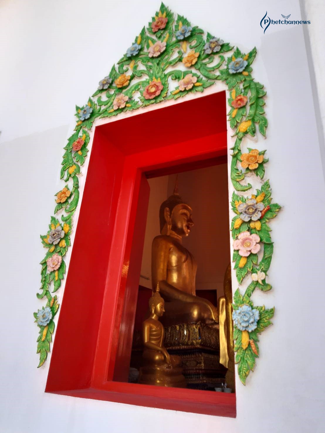 พระพุทธรัตนมหาพรม เป็นพุทธรูปก่ออิฐถือปูนปางมารศรีวิชัย มีพระพักต์เบิกกว้าง พระสรวลยิ้มสีแดง ประดิษฐานอยู่ภายในพระอุโบสถสีขาว หน้าบันของพระอุโบสถเป็นปูนปั้นลายดอกไม้